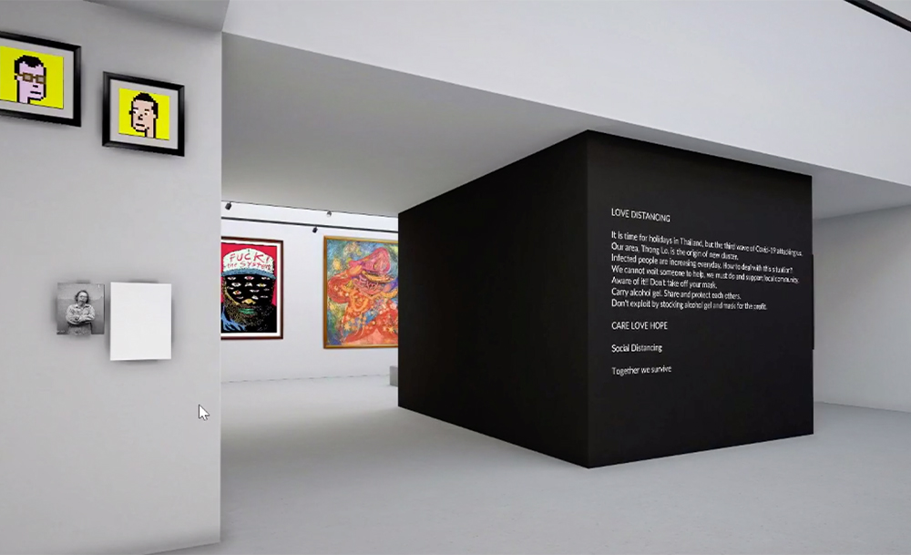 สำหรับนิทรรศการ Love Distancing ครั้งนี้ จัดแสดงอยู่บนแพลตฟอร์ม Artsteps ซึ่งเราสามารถทะลุเข้าไปเดินชมกันได้ประหนึ่งไปเดินชมที่แกลเลอรี Palette Artspace จริง ๆ เลยล่ะ