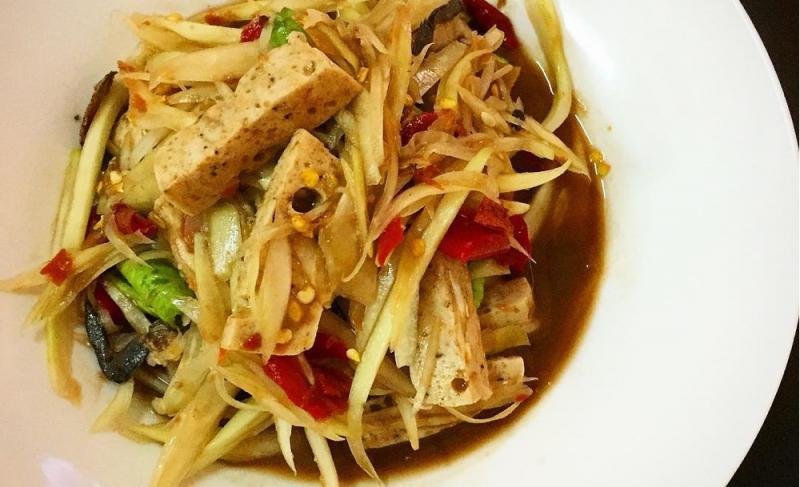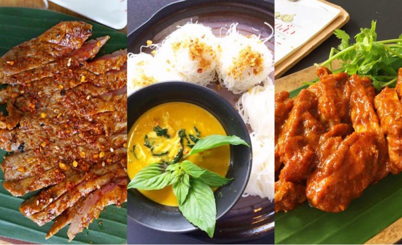 เมนูที่เราแนะนำคือ ส้มตำกลิ่นกลั้ว ซึ่งเป็นส้มตำไทยโปะหน้ามาด้วยคาลามารี หรือ หมึกชุบแป้งทอด หรือจะสั่งอีกเมนูเด็ดอย่างส้มตำหมูยอก็ไม่ว่ากัน ถ้ายังจี๊ดไม่พอขอแนะนำให้สั่งหมี่น้ำยาปูรสเข้มข้น ที่เสิร์ฟมาสำหรับ 2-3 คน และให้เนื้อปูแน่นถ้วยแบบตักไปเท่าไหร่ก็เจอแต่ปู ส่วนสายโปรตีนเรามีเมนู ไก่กอแระ ที่เป็นไก่ทอดคลุกซอสแดงแกงใต้ และ เนื้อย่างพริกลาบคั่ว มากระตุ้นต่อมน้ำลายให้ซาบซ่านอย่างถ้วนทั่ว