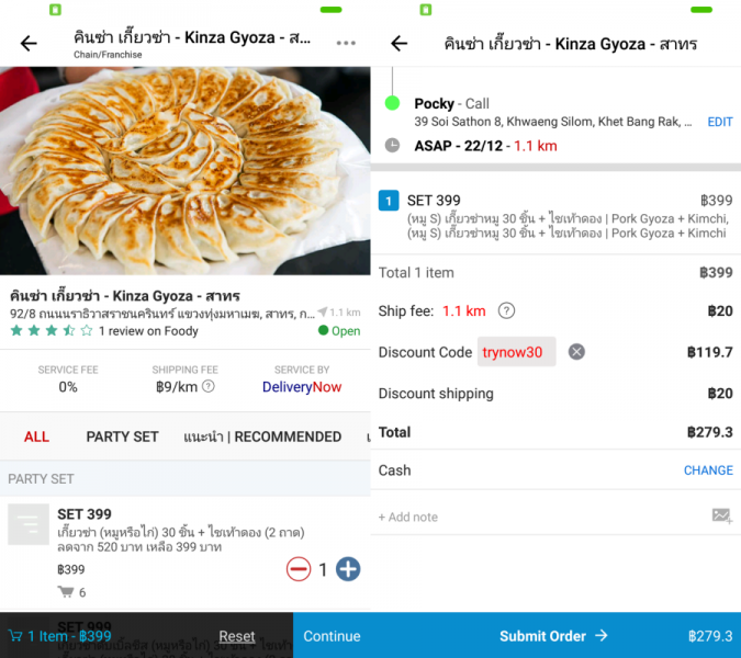 และเพื่อไม่ให้เสียเวลาเราจึงทำการทดลองใช้แอปนี้ทันทีด้วยการสั่งเกี๊ยวซ่าสุดฮิต คินซ่า เกี๊ยวซ่า ที่เพิ่งมาเปิดสาขาใหม่ใกล้ออฟฟิศของเรานี่เอง ซึ่งกดเข้าไปทีแรกก็ถึงกับผงะเพราะตัวแอปแจ้งขึ้นมาว่าที่ คินซ่า เกี๊ยวซ่า ขณะนี้มีคำสั่งซื้อเยอะมาก อาจต้องใช้เวลานานหน่อยนะ แต่ด้วยความอยากลอง (และอยากกิน) ทำให้เราตัดสินใจที่จะสั่งซื้อและนั่งรอแม้จะนานก็ตาม ซึ่งก็ถือว่าคุ้มค่า เพราะหลังจากใช้โค้ด เซ็ตเกี๊ยวซ่าสองถาดของเราก็ลดราคา 30% จาก 399 บาท เหลือ 280 บาทเท่านั้น! แถมยังไม่ต้องเดินร้อนออกไปซื้อ เพราะเมื่อถึงเวลาก็มีคุณพี่ในเครื่องแบบแดง-น้ำเงินขี่รถมาส่งให้เราถึงที่เลย