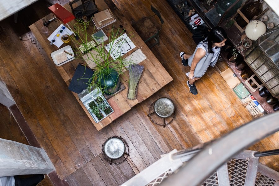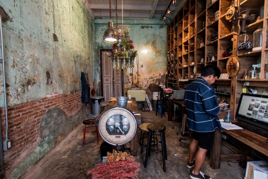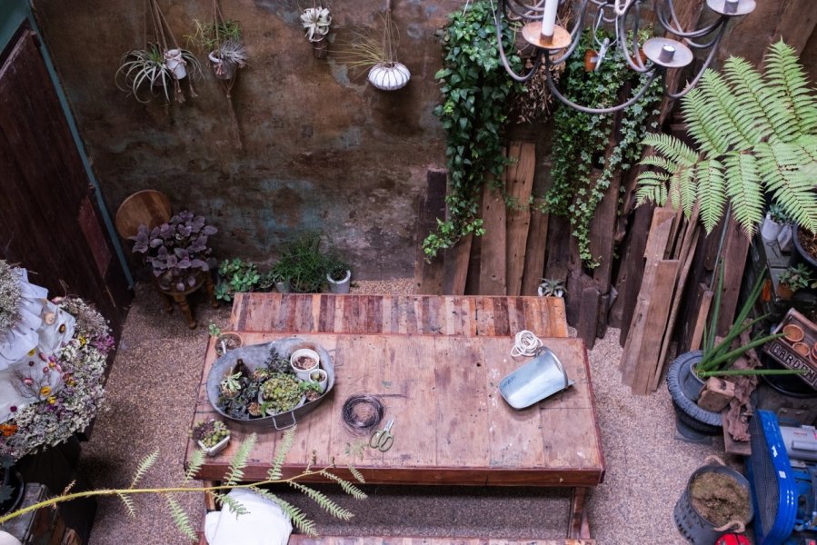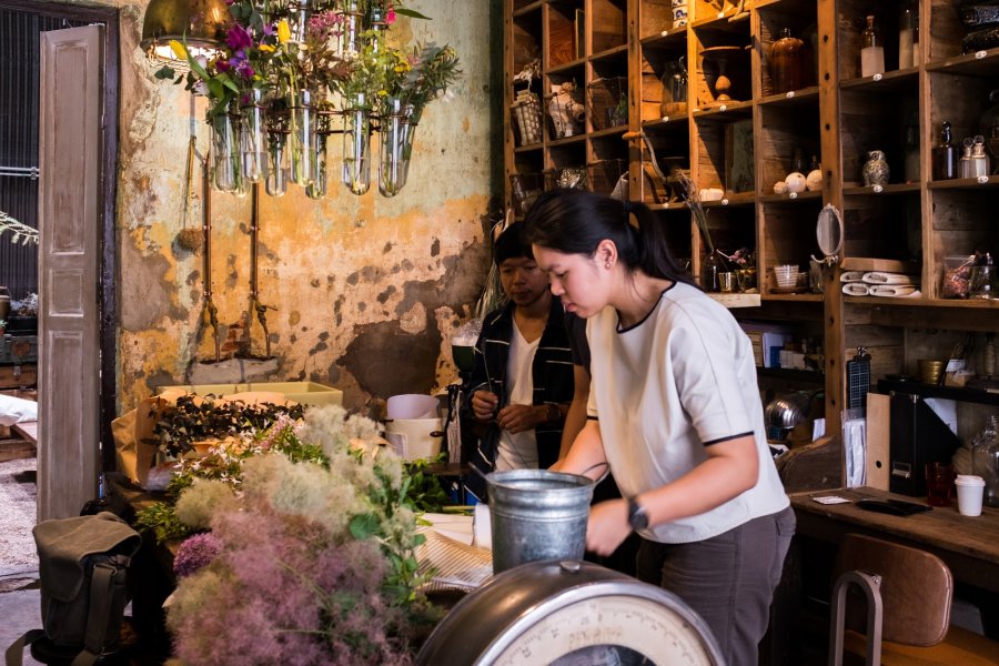 ใครคุ้นเคยกับย่านซอยนานา Oneday Wallflowers Oldtown ก็คือตึกห้องแถวที่เคยถูกเช่าเป็นร้านหมักชา Pure Luck นั่นเอง ทันทีที่เหยียบเข้าไปในร้าน เราได้กลิ่นหอมๆ จากเหล่ามวลแมกไม้ที่ทีมงานกำลังจัดตามออร์เดอร์ล่าสุดที่เข้ามา ซึ่งมันเป็นความรู้สึกที่สงบ สบาย และไม่เหมือนอยู่ในความวุ่นวายของกรุงเทพฯ ด้านในมีกลิ่นอายความเป็นกระท่อมในชนบท ผสมอินดัสเตรียล “ข้าวของเครื่องใช้ข้างในจะเป็นสไตล์อิงลิชคอทเทจ มีของเก่า มีวัสดุธรรมชาติ งานคราฟต์ งานเหล็กมาสผม บวกกับความเป็นโรงนาด้วยเฟอร์นิเจอร์ไม้ มี skylight (หลังคากระจก) เพื่อรับแสงธรรมชาติเข้ามาข้างใน”