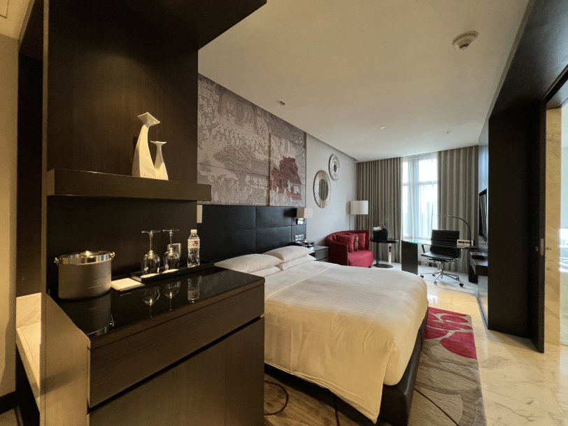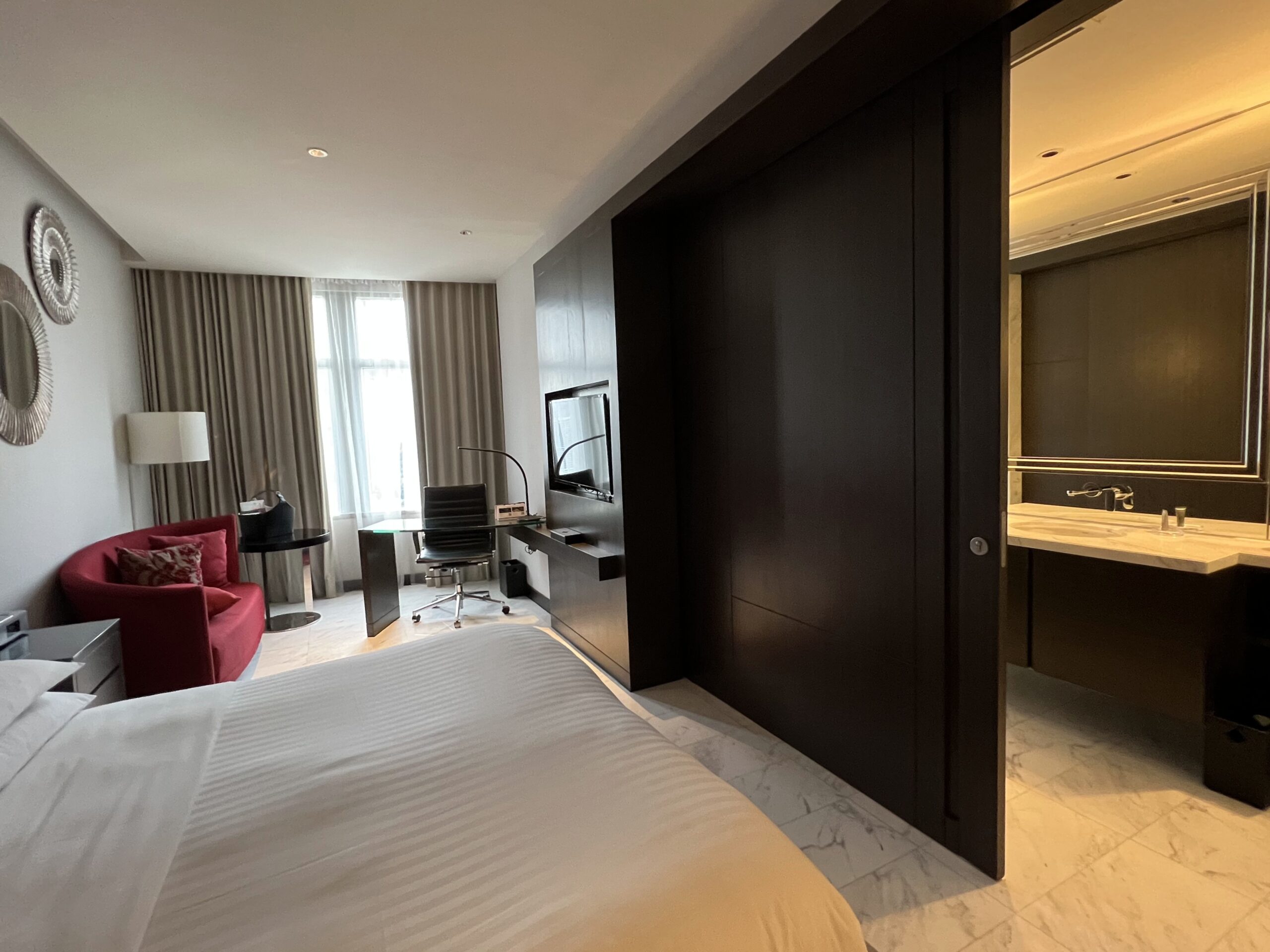 สิ่งที่โดดเด่นมาก ๆ สำหรับห้องพักที่เราได้คือการแบ่งพาร์ทิชันพื้นที่ใช้สอยไว้อย่างเป็นสัดส่วน และค่อนข้างยูนีก (อาจจะเป็นที่แปลนชั้นนั้นอยู่แล้วก็ได้ และอาจจะไม่ถึงขั้น 'แตกต่าง' ขนาดนั้น ส่วนตัวเราแค่ไม่เคยพักห้องแพตเทิร์นนี้เท่านั้นเอง) เริ่มต้นจากพื้นที่ foyer ย่อม ๆ เมื่อเราก้าวเท้าผ่านประตูเข้ามา ที่ปิดกั้นสายตาเราจากตัวห้องที่เหลืออย่างสิ้นเชิง คือทั้งรองเท้า ทั้งกระเป๋าเดินทาง จะถูกแยกออกจากโซนพักผ่อนไปโดยปริยาย จากนั้นถึงเชื่อมต่อมายังตู้เสื้อผ้าและมินิบาร์