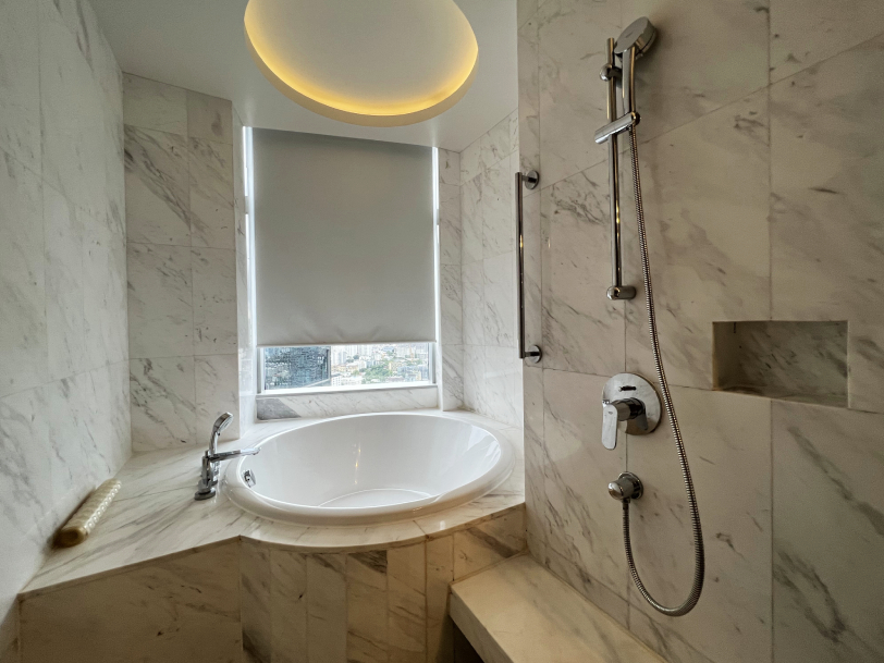 ถัดจากเตียงนอนและห้องน้ำก็เป็นโซนออฟฟิศและโซฟาไว้นั่งทำงานและนั่งเล่น โดยมีทีวีจอใหญ่เป็นเสมือนแลนด์มาร์กของบริเวณนี้ ตั้งเยื้องถัดจากปลายเตียงอย่างเป็นสัดส่วน ส่วนนี้สามารถเปิดม่านรับแสงธรรมชาติได้เต็มที่ เหมาะกับการถ่ายรูปในหลายช่วงเวลาของวัน ซึ่งตรงอ่างอาบน้ำของห้องเราก็มีหน้าต่างอยู่ด้านเดียวกันนี้เหมือนกัน ทำให้เหมาะมากที่จะทำคอนเทนต์ bath bomb ตีฟองฟูแล้วเปิดม่านชมวิวทิวทัศน์ยามค่ำคืน