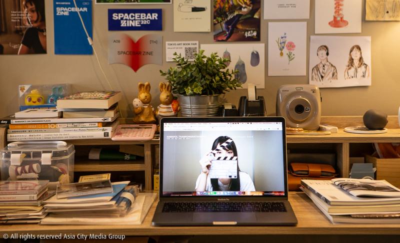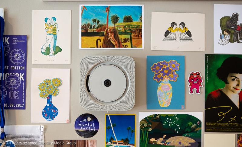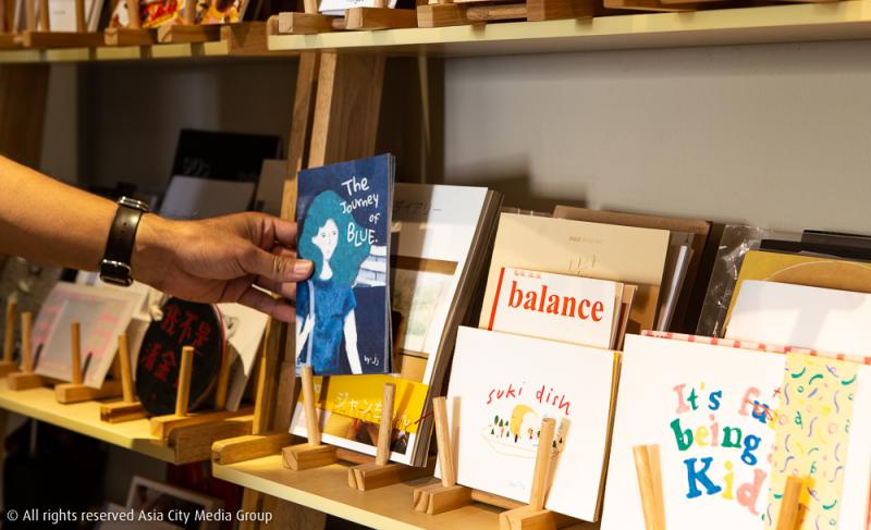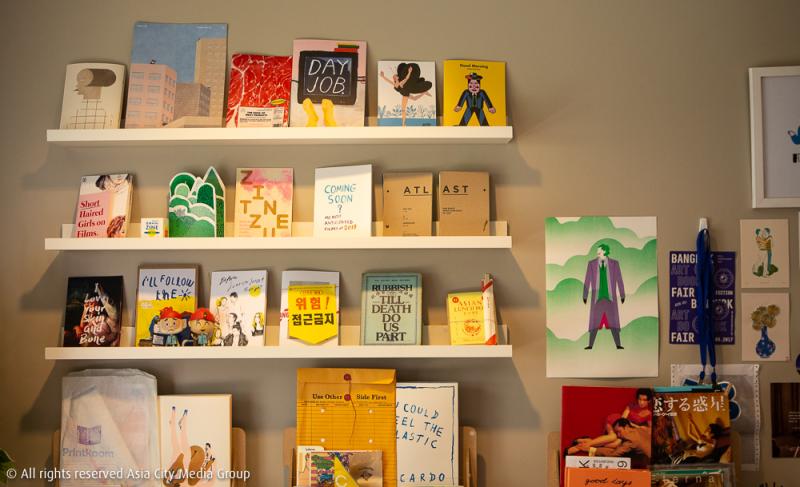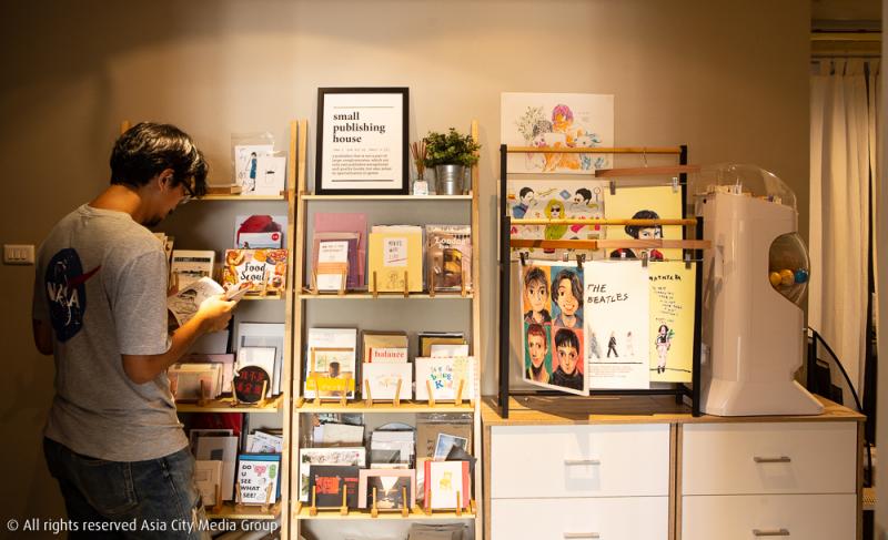 โดยจะมีโซนด้านหน้าเป็นชั้นวาง Zine ที่ทางสตูดิโอได้ร่วมมือกับศิลปินหรือนักเขียนเพื่อผลิตผลงานออกมาในจำนวนที่จำกัด เราจึงได้เห็นซีนหน้าตาน่ารักมากมายวางล่อตาล่อใจตั้งแต่ก้าวเข้ามาในสตูดิโอ รวมถึงตรงนี้เขาก็วางขายโปสเตอร์ติดผนังและตู้กาชาปองที่สามารถหยอดเหรียญและหมุนเอากาชาปองที่ใส่ซีนเล่มเล็กจิ๋วไว้ด้านใน เพิ่มความสนุกเข้าไปอีกแบบ สำหรับการเข้ามาจับจ่ายซื้อขาย Zine ก็สามารถนัดแนะกับสตูดิโอเพื่อเข้ามาซื้อที่นี่ได้เลย หรือสั่งผ่านช่องทางออนไลน์ที่แชตเพจ ซึ่งในอนาคตเขาจะพัฒนาระบบเว็บไซต์ให้สามารถสั่งออนไลน์ผ่านเว็บได้เลย
