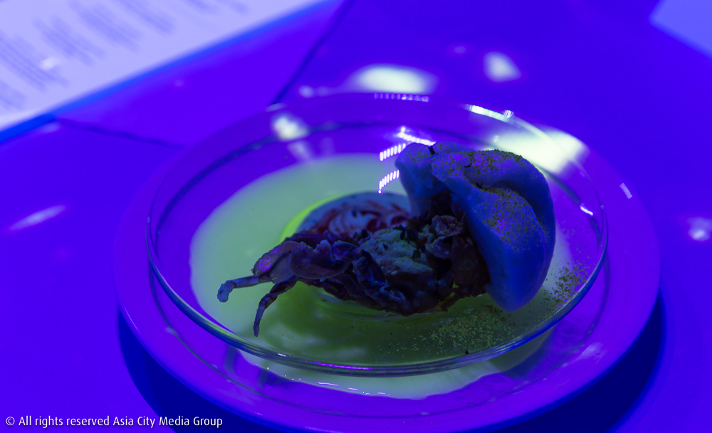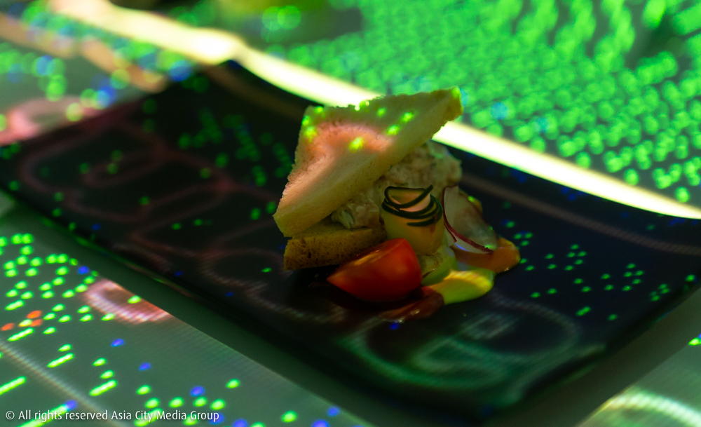 เริ่มจากคอร์สแรกที่เสิร์ฟมาคือ Chapter 1: 7th Heaven ที่ชวนให้เราจินตนาการไปไกลถึงร้านสะดวกซื้อในอนาคตผ่าน Projection Mapping สีฉูดฉาด และซาวนด์ล้ำ ๆ เหมือนหลุดไปในหนัง Sci-fi สักเรื่อง พร้อมเสิร์ฟเมนูง่าย ๆ อย่างแซนด์วิช ที่เราสามารถหยอดเหรียญแล้วกดออกมาได้เลยจากตู้ แต่ทีมนี้เขาทำให้เราได้ตั้งคำถามกับแค่เมนูธรรมดา ๆ นี้ ว่าจะสามารถทำขึ้นใหม่ให้ดีต่อใจและสุขภาพได้กว่านี้อีกหรือไม่ อย่างการเปลี่ยนจากขนมปังชืด ๆ พร้อมขึ้นราให้กลายเป็นบริยอชบิสกิตสไตล์ฝรั่งเศส และสอดไส้ด้วยแซลมอนทาร์ทาร์แทนเนื้อสัตว์แปรรูปไร้คุณภาพจากอุตสาหกรรมอาหาร