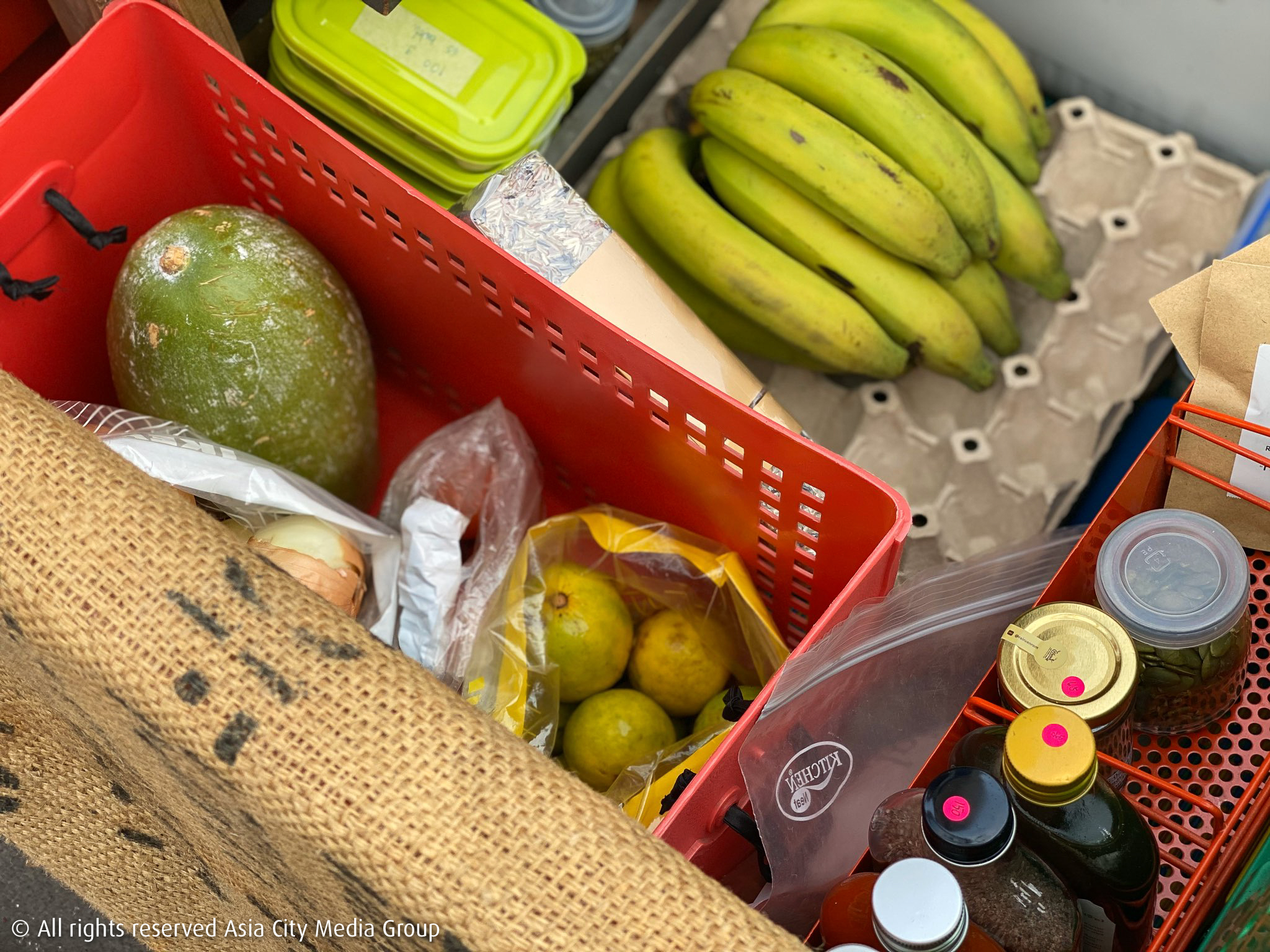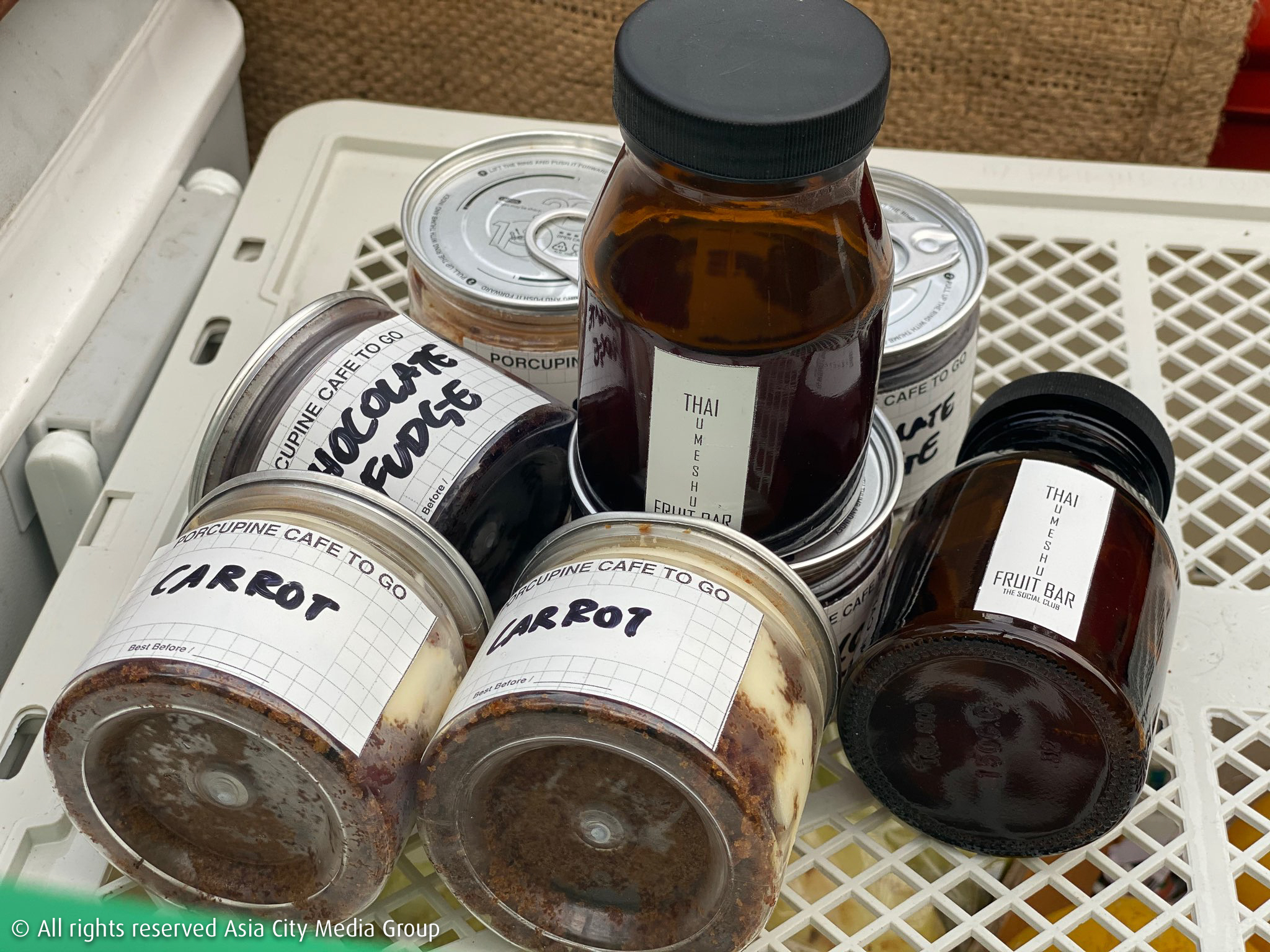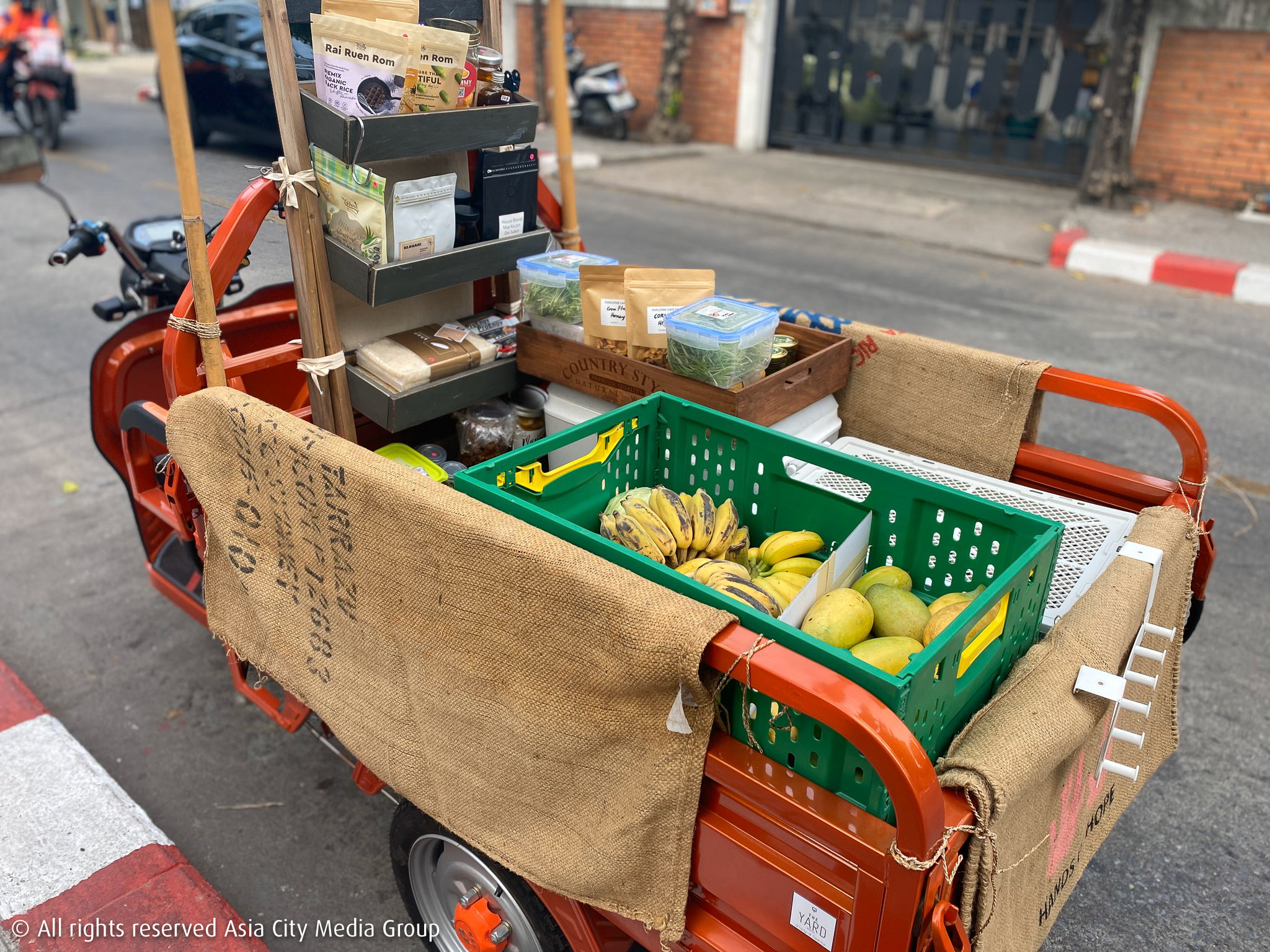 ไอเทมสารพัดนึกแบบแรนด้อมสุด ๆ เลยถูกวางรวม ๆ กันอยู่ในรถสามล้อสีแดงคันนี้ให้คนที่เดินผ่านไปผ่านมาในย่านอารีย์ได้แวะหิ้วกลับบ้าน เริ่มตั้งแต่มะม่วงหลากหลายสายพันธุ์ ทั้งอกร่อง เขียวเสวย น้ำดอกไม้ ไปจนถึงฝรั่ง เมลอน มังคุด มะพร้าว ผักสลัด กะหล่ำปลี หัวไชเท้า แคร์รอต ทุกอย่างปลูกแบบปลอดสารพิษส่งตรงจากโลคอลฟาร์ม ส่วนนอกเหนือจากผักผลไม้สด ก็ยังมีไอเทมจากคาเฟ่ในละแวกนี้อย่างแคร์รอตเค้กและกาแฟอัดกระป๋องจาก Porcupine Cafe โคลด์บริวจาก PM Cafe เบอร์เกอร์จาก Paper Butter ไปจนถึงน้ำบ๊วยของ Fruit Bar The Social Club