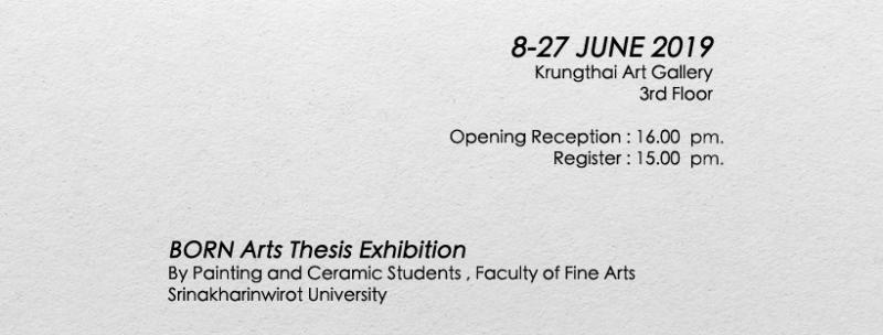 และงานสุดท้าย งานนิทรรศการศิลปนิพนธ์ที่ใช้คำว่า Born เป็นคีย์เวิร์ดหลัก โดยเปรียบนิทรรศการนี้เป็นเสมือนสื่อกลางทางความคิดที่จุดประกายจินตนาการให้นักศึกษาและสังคม เป็นอีกหนึ่งนิทรรศการจากนิสิตชั้นปี 4 ของมหาวิทยาลัยศรีนครินทรวิโรฒ ซึ่งเราจะได้ดูงานของเด็ก ๆ จากคณะศิลปกรรมศาสตร์ สาขาทัศนศิลป์ เอกจิตรกรรมและเซรามิค พร้อมซึมซับคอนเซปต์แสนลึกล้ำที่ไปดูแล้วก็ต้องดื่มด่ำพิจารณาความหมายภายใน โดยงานจะจัดกันที่หอศิลป์กรุงไทยย่านเยาวราช ในเดือนมิถุนายนที่จะถึงนี้