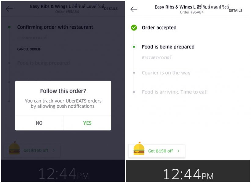 ระหว่างรอพี่อูเบอร์ เราสามารถติดตามออเดอร์ได้จากเมนูในแอป เรารอประมาณ 40 นาทีก็ได้รับโทรศัพท์เพื่อรับออร์เดอร์ โดยพี่อูเบอร์ของเรามาในรูปแบบมอเตอร์ไซค์ อิ่มท้องแล้วแหละมื้อนี้!