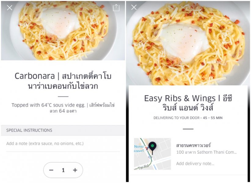 เราลองสั่งสปาเก็ตตี้คาโบนาร่าเบคอนกับไข่ลวกของร้าน Easy Ribs & Wings ซึ่งวิธีการสั่งก็ไม่ได้ยุ่งยาก แค่เลือกจุดรับอาหาร (ที่อยู่ของเรา) เลื่อนดูร้านอาหารที่สนใจ จิ้มเมนูที่อยากกิน และกดคอนเฟิร์มออเดอร์ก็เสร็จสิ้น