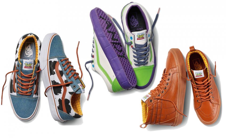 ความเก๋อีกอย่างคือรุ่นหุ้มข้อหนัง SK8-Hi Reissue ที่นำโมเดลเก่าอย่าง SK8 มาใส่ลวดลายแสดงถึงความเป็นตัวการ์ตูนอย่าง Woody ด้วยรองเท้าหนังล้วนสีน้ำตาลแบบคาวบอย ไปจนถึงลายแบบหนังวัวตัดกับหนังสีน้ำตาลผสมสีพื้นจากเดนิม ส่วนรุ่น Buzz Lightyear ก็เป็นรองเท้าหนังสีเขียวตัดกับม่วง สีประจำตัวเจ้าหนุ่มผู้พิทักษ์อวกาศนั่นเอง