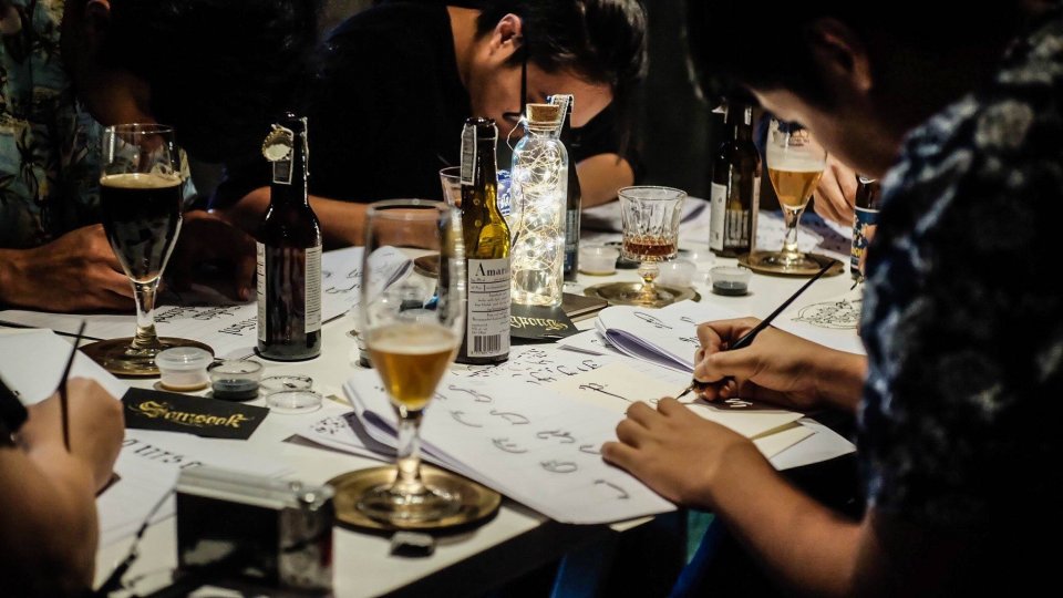 คอร์สเวิร์คช็อปที่ได้ทั้งจิบเบียร์ทั้งเรียนการเขียน Calligraphy แบบยิงปืนนัดเดียวได้นกสองตัว แถมยังฮิตไม่เลิกจนต้องมาทำ Ep.2 ซึ่งพิเศษกว่าคอร์สอื่นๆ เพราะครั้งนี้เป็นการสอนเขียน Calligraphy ด้วยปากกาจุ่มหมึกเป็นภาษาไทย และเพื่อให้เข้าธีม เค้าเลยมีคราฟต์เบียร์ไทยให้จิบด้วยล่ะ แถมราคานี้ยังรวมมื้ออาหารเย็นไว้เรียบร้อยแล้วนะ