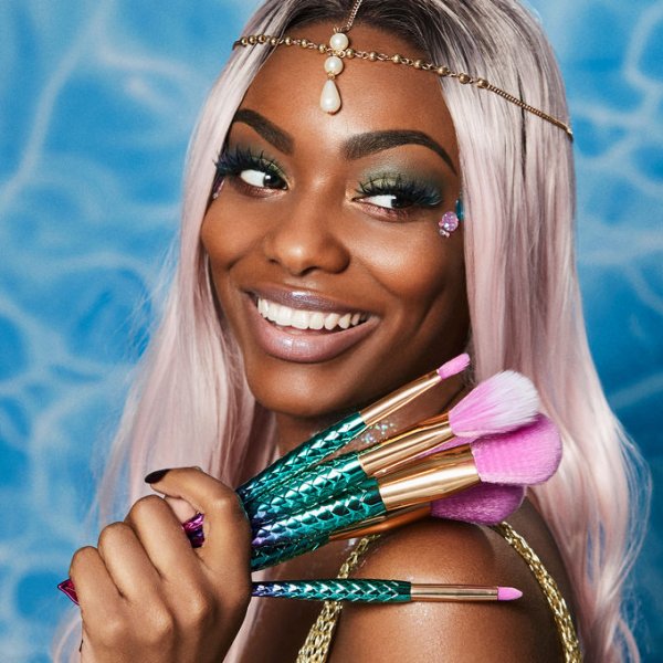 เซ็ตแปรงหางนางเงือกไฮไลท์ของคอลเลกชันนี้ที่มีชื่อเล่นว่า 'FIN-tastic' ประกอบไปด้วยแปรงหัวแหลม หัวโดม แปรงไฮไลท์ แปรงปัดแก้ม และแป้งสำหรับแป้งฝุ่น ตัวขนแปรงสีชมพูฟูฟ่องอันนั้นคือเป็น Vegan Friendly หมายความว่าไม่ได้ทำมาจากขนสัตว์นะจ๊ะ