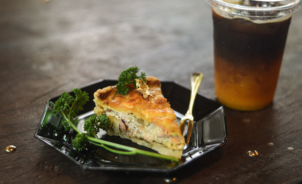 ชิ้นแรกที่เราได้รับเกียรติให้เป็นผู้ประเดิมก่อนจะเป็นเมนูใหม่ที่เสิร์ฟในร้านก็คือ พายแซลมอนซอสครีม ที่คุณแม่เล่าว่า เป็นเมนูที่ทำขึ้นเพื่อเอาใจคุณผู้ชายที่พาแฟนมาร้านคาเฟ่ แล้วอยากได้อะไรหนักท้อง ซึ่งพอชิมแล้วขอบอกเลยว่า อาจจะหนักท้องจริง ๆ เพราะกินแล้วหยุดไม่ได้เลย เราชอบเนื้อครีมที่รสชาติเข้มข้นและแน่นหนุบหนับของจานนี้มาก ๆ แต่ที่ประทับใจที่สุดก็คือแป้งพายที่กรอบร่วนกำลังดี โดยเฉพาะตรงส่วนพายครัสต์นี่คือเลิศเลอหาที่ติไม่ได้จริง ๆ