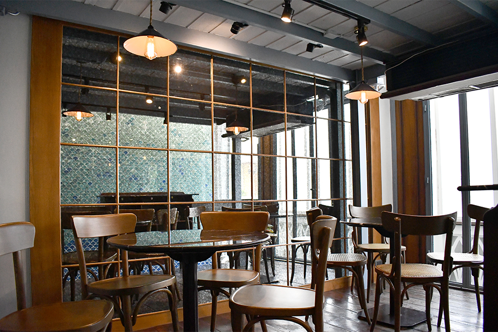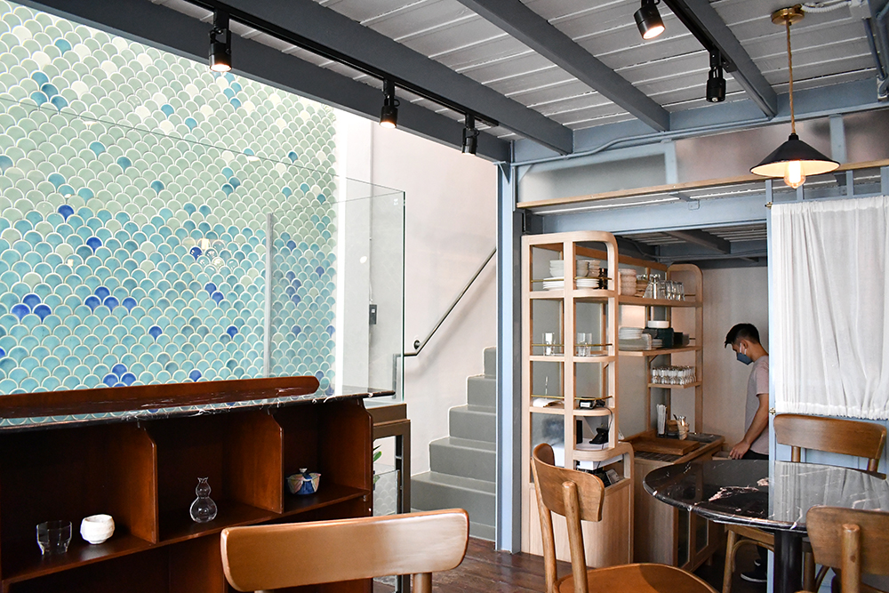 ผนังเกล็ดปลาวาฬไล่เฉดตั้งแต่สีขาวไปจนถึงสีน้ำเงินที่ทอดตัวยาวลงมาตั้งแต่ชั้น 3 จนถึงชั้นล่าง ยังเป็นการตกแต่งเดียวที่ถูกเก็บไว้เพื่อคงกลิ่นอายความเป็น Blue Whale ฉบับดั้งเดิม แต่ที่เพิ่มเติมคือพื้นที่เคาน์เตอร์บาร์ชั้นล่างที่ถูกปรับให้แขกสามารถนั่งแลกเปลี่ยนบทสนทนากับเจ้าของร้านที่ยืนง่วนทำเมนูต่าง ๆ อยู่หลังบาร์ได้แบบใกล้ชิดติดขอบ ชั้น 2 ถูกแทนที่ด้วยมู้ดเป็นส่วนตัวของโต๊ะทานอาหารไซซ์ใหญ่ และโต๊ะกินข้าว (หรือใครจะมาใช้ประชุมงานก็ได้เหมือนกัน) ขนาดยักษ์บนชั้น 3 เพื่อรองรับไลฟ์สไตล์ที่จริงจังมากขึ้น เป็นผู้ใหญ่มากขึ้น และแน่นอนว่าโต๊ะขนาดใหญ่ที่เพิ่มเติมมานี้ ตอบโจทย์จานอาหารไซซ์ใหญ่ที่ร้านนี้เสิร์ฟได้เป็นอย่างดี