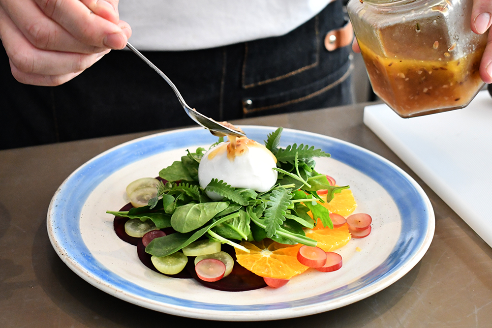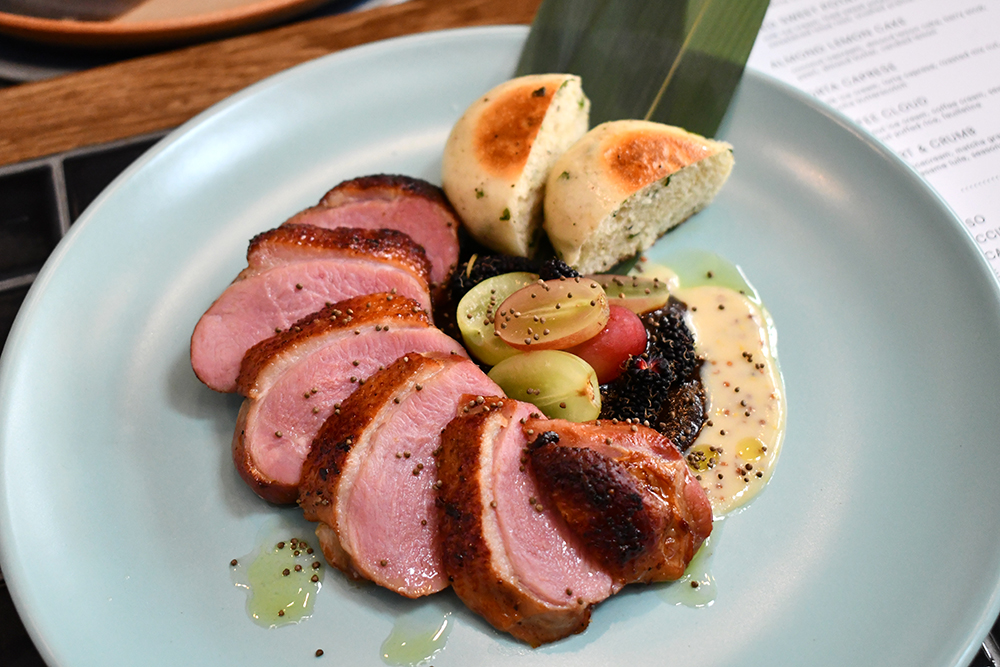 อย่าง Lavender Salad (320 บาท) จานนี้ที่เหมือนเป็นซิกเนเจอร์สลัดของร้าน มีทีเด็ดอยู่ที่ยอดสดของต้นลาเวนเดอร์ที่ทำให้สลัดจานนี้แฝงกลิ่นฟลอรัลโน้ตอยู่ เข้ากันดีกับน้ำสลัดยูซุเดรสซิ่งทำเองรสเปรี้ยวหวาน และอีกจานพิเศษอย่าง Duck & Bun (430 บาท) เป็ดรมควันที่นำไปชโลมด้วยน้ำส้มสายชูและมัสตาร์ด ให้ฟีลเหมือนกินเป็ดปักกิ่งพร้อมตัดเลี่ยนด้วยหมั่นโถวทำเองสุดฟินนาเล่
