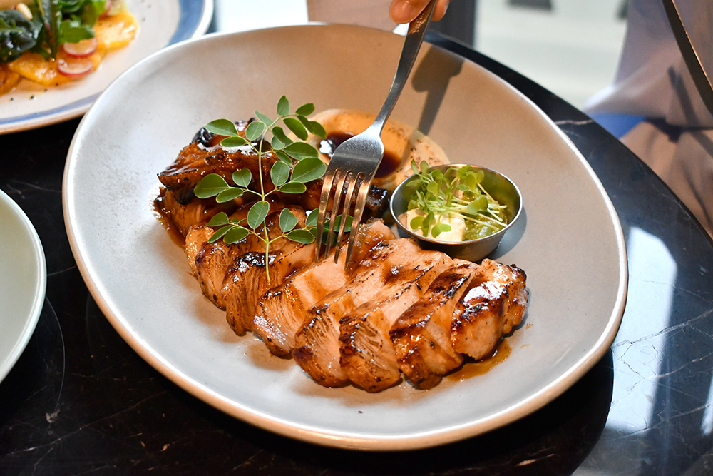 ต่อกันที่จานหลักไฮไลต์อย่าง Koji Pork Chop (560 บาท) พอร์กชอปที่นำไปหมักกับชิโอะโคจิ (ข้าวหมักเกลือ) ราดด้วยซอสสาเกที่ดัดแปลงมาจากซอสไวน์แดงแบบธรรมดา แถมด้วย Puree ดอกกะหล่ำรสติดหวานที่ทำให้จานหลักจานนี้อิ่มจุกจนแทบคลานออกจากร้าน!