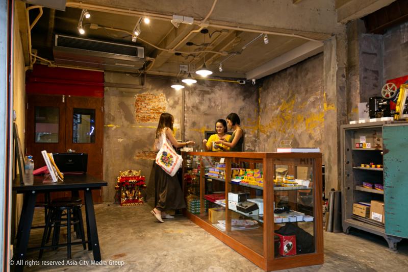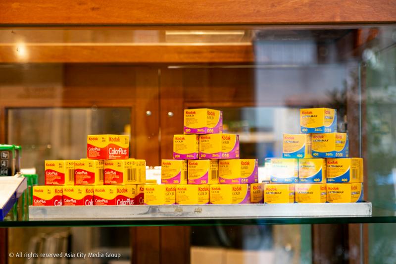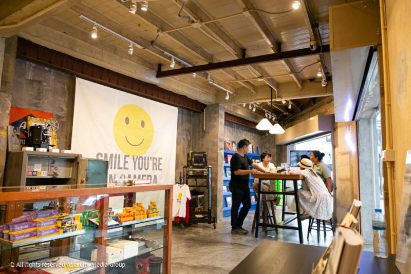 เช่นเดียวกันกับพื้นที่ชั้นล่างซึ่งตอนนี้แบ่งเป็นโซนขายสินค้าแอนะล็อกที่หลายคนกำลังตามหา อาทิ กล้องฟิล์มใช้แล้วทิ้งแบบ Dead Stock ไปจนถึงคราฟต์ฟิล์มนำเข้าจากกรุงเมลเบิร์นอย่าง Film Never Die ที่พี่เจตบอกว่าตอนนี้สต็อกของที่ร้านน่าจะมีเยอะกว่าที่เมลเบิร์นเองซะอีก และแบ่งอีกมุมไว้สำหรับโซนขายหนังสือเกี่ยวกับการถ่ายรูปที่ไม่ว่าใครก็สามารถมานั่งล้อมวงพูดคุยเรื่องการถ่ายรูปได้ที่โต๊ะตัวใหญ่กลางร้าน