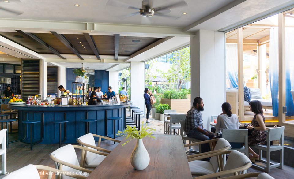 บริเวณโถงใหญ่ที่เราพูดถึงนี้ก็คือโซน Eatery เสิร์ฟอาหารสไตล์ตะวันตกผสมผสานความเป็นไทย โดยใช้วัตถุดิบท้องถิ่นจากทั่วประเทศถึง 80% เมนูส่วนใหญ่ออกแนวทาปาส ชิ้นเล็กชิ้นใหญ่ผสมกันไป ส่วนบาร์ตรงกลางก็เสิร์ฟทั้งม็อกเทล ค็อกเทล เบียร์ และเหล้า เหมาะกับการชวนเพื่อนมานั่งแฮงค์เอ้าท์พูดคุยกันสบายๆ