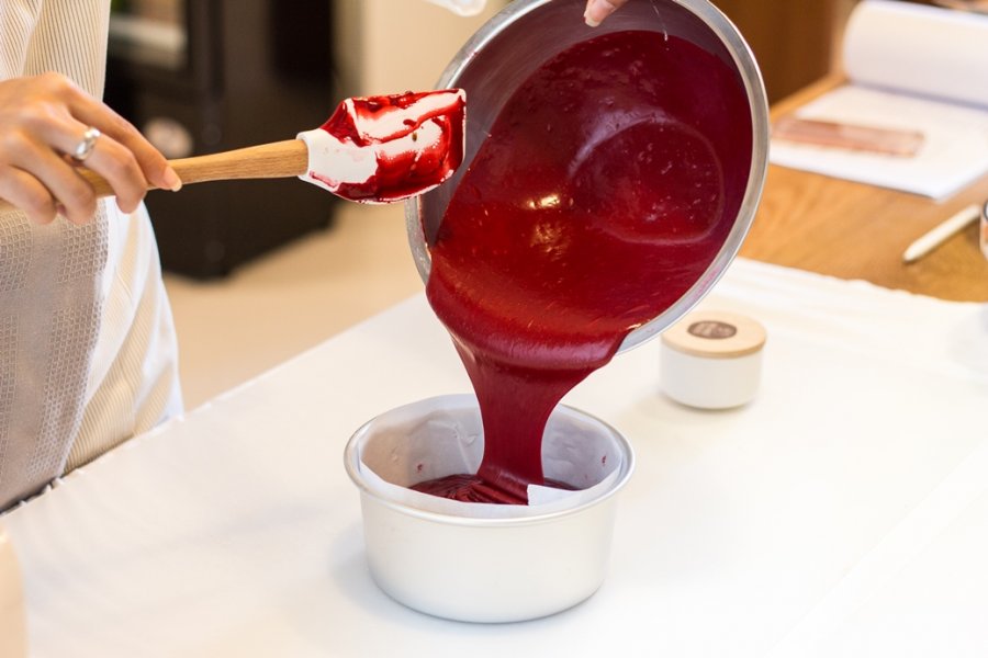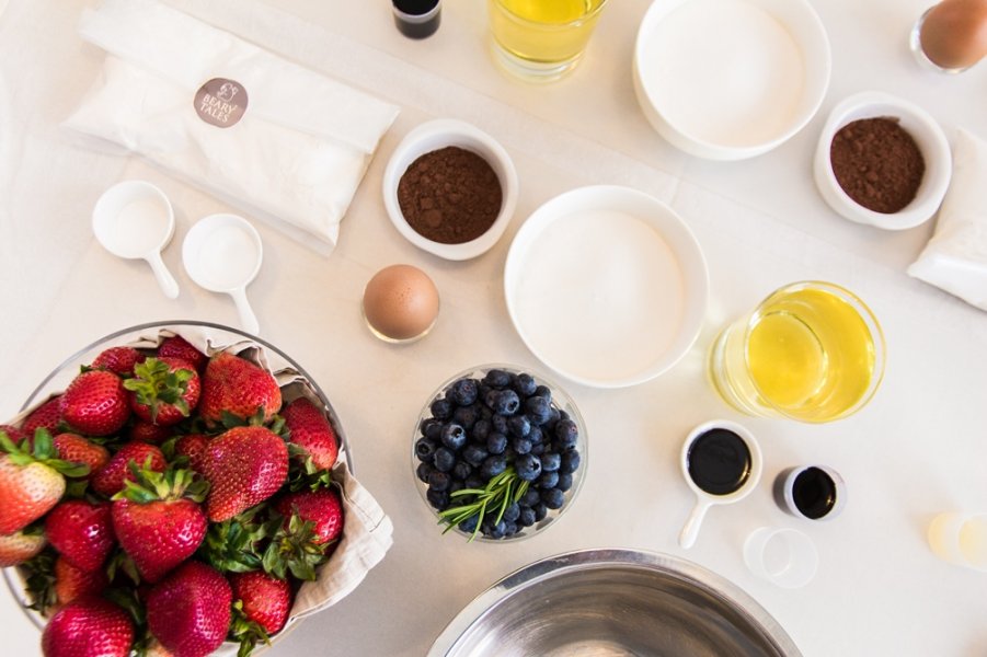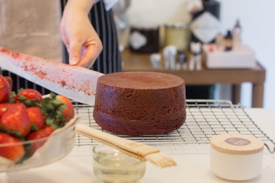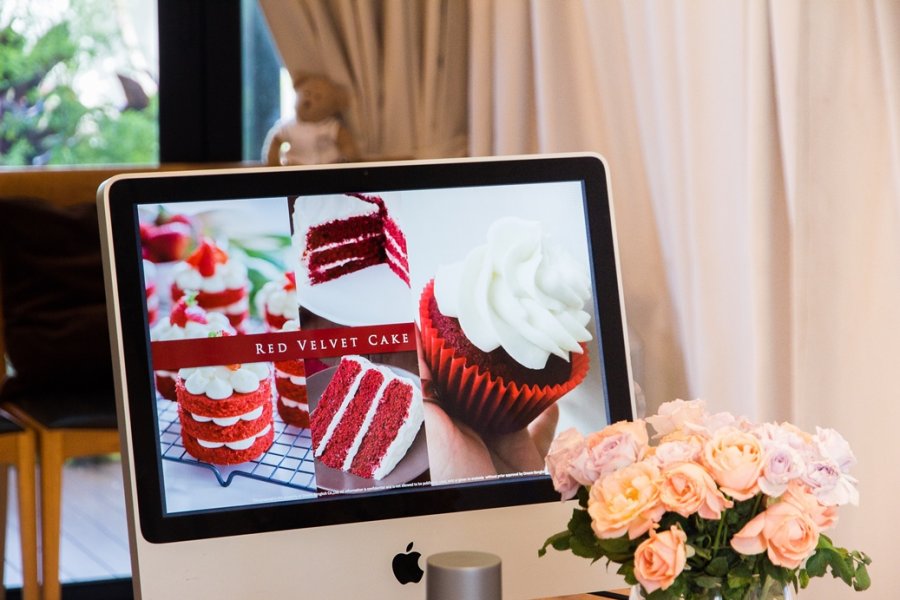 ตอนแรกเชฟเอมี่ก็อธิบายเมนูที่เราจะทำในวันนี้ เริ่มจากการอธิบายให้ฟังคร่าวๆ ว่าโดยธรรมชาติแล้วเค้กเวลเวทต้องมีลักษณะเป็นอย่างไร โดยมีการเตรียมสูตรอย่างละเอียดขึ้นหน้าจอ และตวงส่วนผสมทุกอย่างไว้ให้เราอย่างเรียบร้อยแล้วเพื่อเราจะได้โฟกัสกับวิธีทำอย่างเต็มที่ อุปกรณ์ทุกชิ้นที่เราได้ใช้ใหม่เอี่ยมอ่อง แถมน่ารักอีกด้วย ตั้งแต่ผ้ากันเปื้อนที่เชฟได้ซื้อมาจากญี่ปุ่น จนไปถึงเครื่องมือทุกชิ้น ส่วนผสมที่ใช้ก็คุณภาพดีทั้งนั้น ไม่ว่าจะเป็น Cacao Barry ผลไม้จากโครงการหลวง จนไปถึงวานิลลาแท้ๆ และไข่ออร์แกนิก ทั้งนี้เชฟก็เทียบโปรดัคต่างๆ ให้เราฟังเลย ว่าแต่ละอย่างมีข้อดีข้อเสียอย่างไร ตามไปหาซื้อทำเองได้ที่ไหน แค่นี้ก็จินตนาการไปไกลแล้วว่าอยากมีครัวแบบนี้เป็นของตัวเองบ้าง