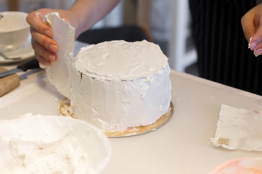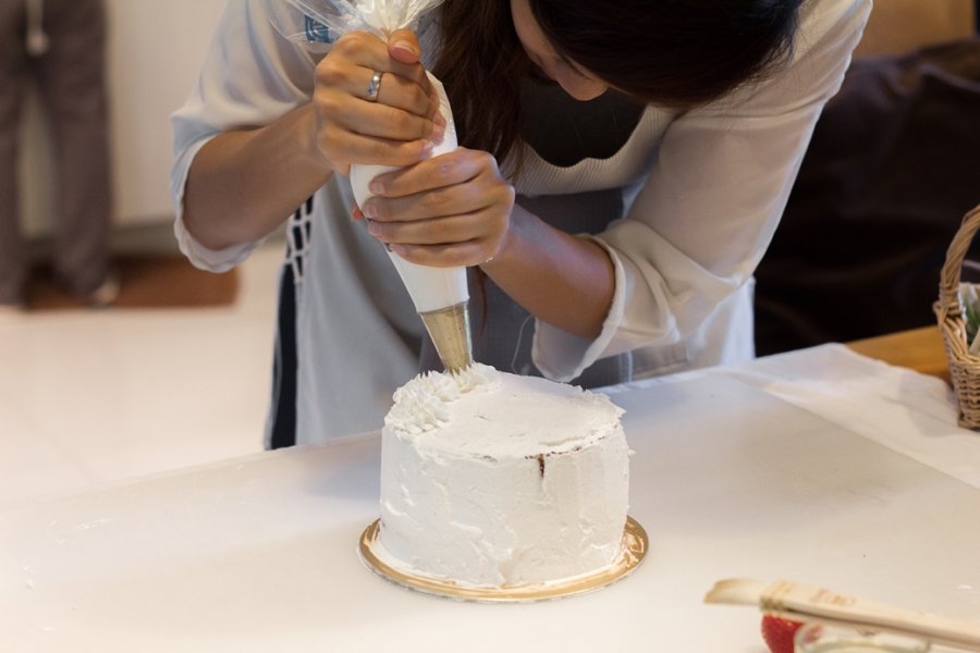 พอเค้กเสร็จเรียบร้อยออกจากเตาพอดี เราก็เริ่มเข้าขั้นตอนผสมครีมชีส และเริ่มปาดครีมลงบนตัวเค้ก เชฟเอมี่ลงมือทำอย่างคล่องแคล่ว เราเองก็เอ๋อบ้างอะไรบ้าง ครีมไม่เรียบเท่ากันเล้ย! แต่เชฟบอกไม่เป็นไร ของแบบนี้ต้องใช้เวลาฝึกฝน เราเองก็อยากได้สไตล์ Pinterest อยู่แล้ว จะบิดเบี้ยวหน่อยก็คงไม่เป็นไร
