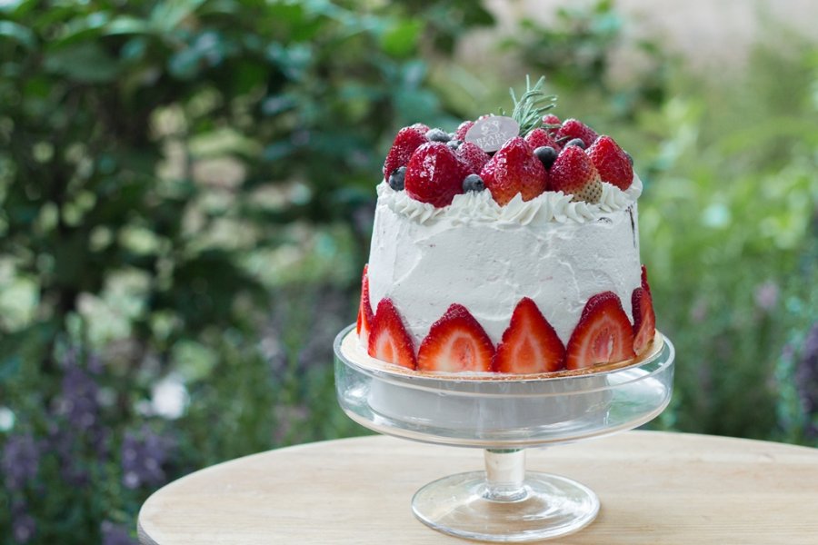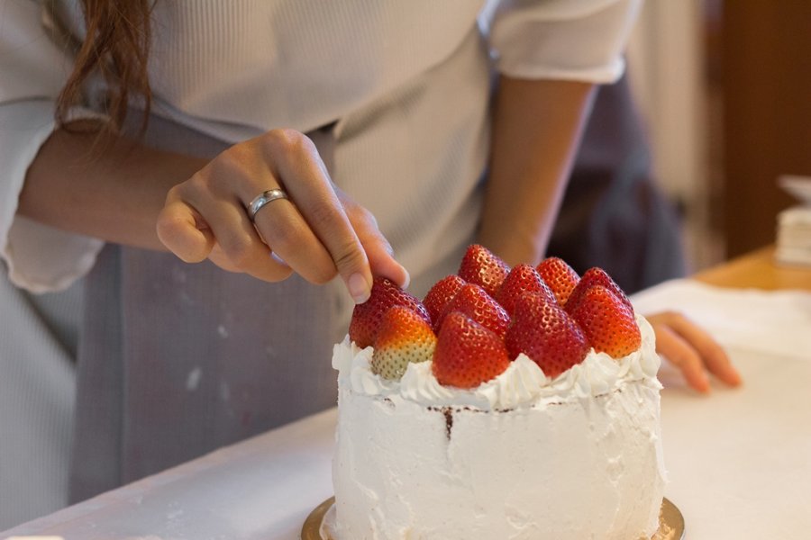 แล้วก็เริ่มหั่นสตรอว์เบอร์รี่ และปักวางลงบนเลเยอร์ครีมตามใจเราเลย เพิ่มเติมอีกเล็กน้อยด้วย rosemary ที่เราเก็บมาสดๆ พร้อมกับโรยด้วยน้ำตาลไอซ์ซิ่งหน่อยๆ เหมือนหิมะ ถือเป็นอันเสร็จเรียบร้อย!