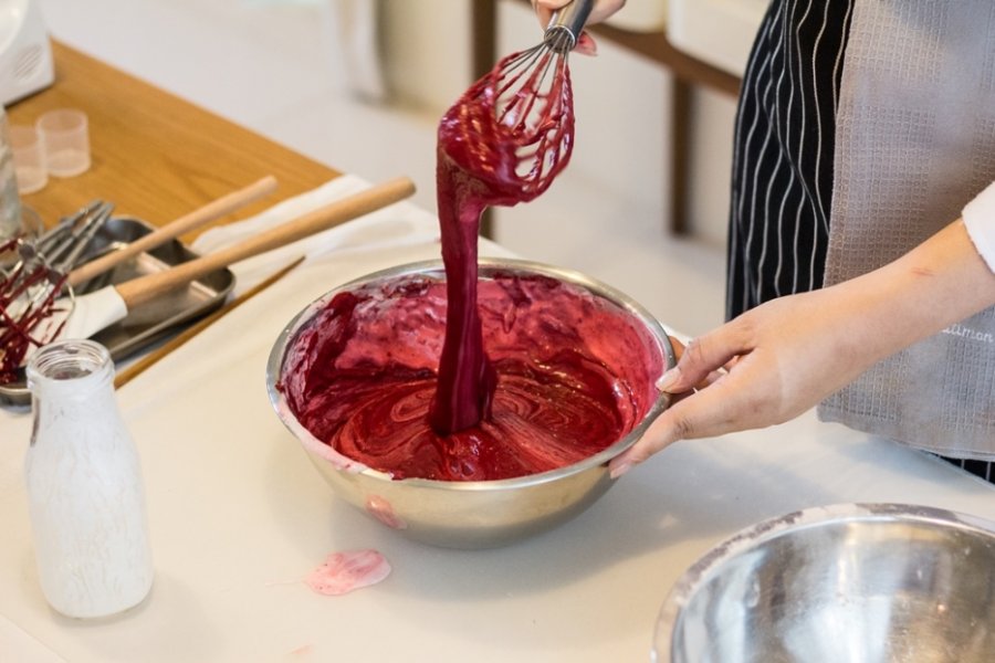 งานนี้ถือว่าได้ออกแรงแขนห้อยๆ ของเราอยู่เหมือนกันนะ เพราะต้องมิกส์แบทเทอร์ด้วยเครื่อง สลับกับใช้ไม้พายด้วยตนเองทั้งสิ้น ซึ่งทุกๆ สเต็ปเชฟจะคอยดูว่าเราทำถูกต้องหรือไม่ และอธิบายเหตุผลไปด้วยว่าสิ่งที่ทำอยู่มันทำไปเพื่ออะไร อย่างการผสมบัตเตอร์มิล์ค การวอร์มเตาไว้ก่อน การตีแป้ง รวมทั้งสิ่งสำคัญที่ต้องสังเกตเวลาดูว่าส่วนผสมของเรานั้นเข้าที่พร้อมนำเข้าเตาหรือยัง แน่นอนว่าเราต้องทำเองทุกขั้นตอน ไม่มีโกงนะ!