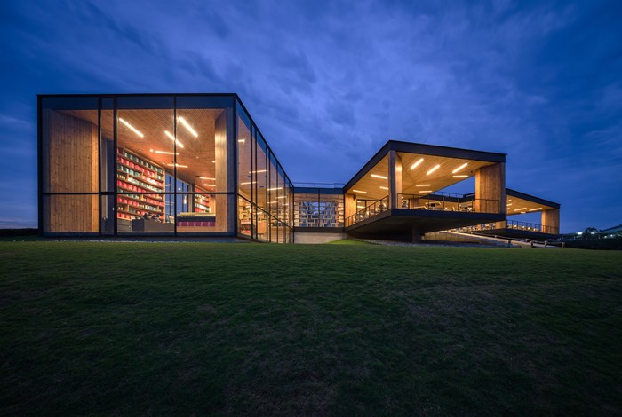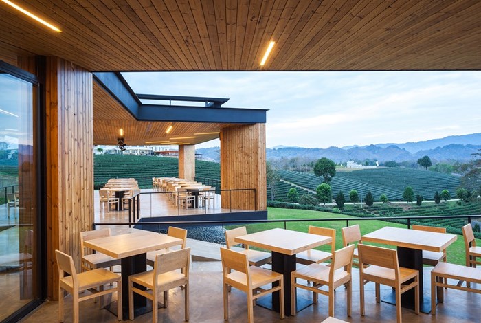 เราชอบที่การออกแบบฝังตัวไปกับยอดเขาทำให้ส่วนฐานของคาเฟนั้นถูกซ่อนเอาไว้ และมีเพียงตัวอาคารทรงกล่องตั้งโดดเด่นอยู่ด้านบน ซึ่งภายในมีทั้งส่วนที่เป็นร้านชาซึ่งเป็นสินค้าหลักของไร่ชาฉุยฟง ไปจนถึงที่ที่นั่งคาเฟ่ซึ่งเสิร์ฟอาหาร และขนมให้เราจิบชาไปพร้อมกับชมวิวไร่ชาสุดลูกหูลูกตา ที่เก๋คือห้องน้ำซึ่งได้รับการออกแบบให้ซ่อนอยู่ใต้โครงสร้างหลัก แต่ก็ยังมีพื้นที่เปิดโล่งให้แสงธรรมชาติส่องลงมาด้วย