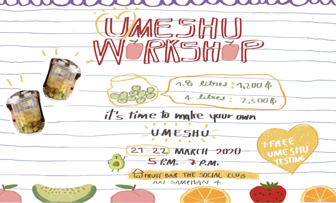 ฤดูทำเหล้าบ๊วยมาถึงแล้ว! มีหรือที่ร้านเหล้าบ๊วยเปิดใหม่สุดคิวต์แห่งซ.อารีย์อย่าง Fruit Bar The Social Club เขาจะพลาด เราเลยอยากชวนทุกคนมาดองเหล้าบ๊วยเป็นของตัวเองเอาไว้กลับไปจิบที่บ้านกันคนละโหลสองโหล ซึ่งความพิเศษของเวิร์กชอปเหล้าบ๊วยที่นี่คือการเลือกใช้บ๊วยออร์แกนิกจากสวนที่เชียงรายเท่านั้น รวมถึงน้ำตาลกรวดออร์แกนิก และเหล้าแปลก ๆ หลากหลายชนิดมาให้เลือกใช้ดอง ใครที่เป็นสายแอลกอฮอล์เชิญพุ่งตัวมาทำเวิร์กชอปนี้ได้เลย!