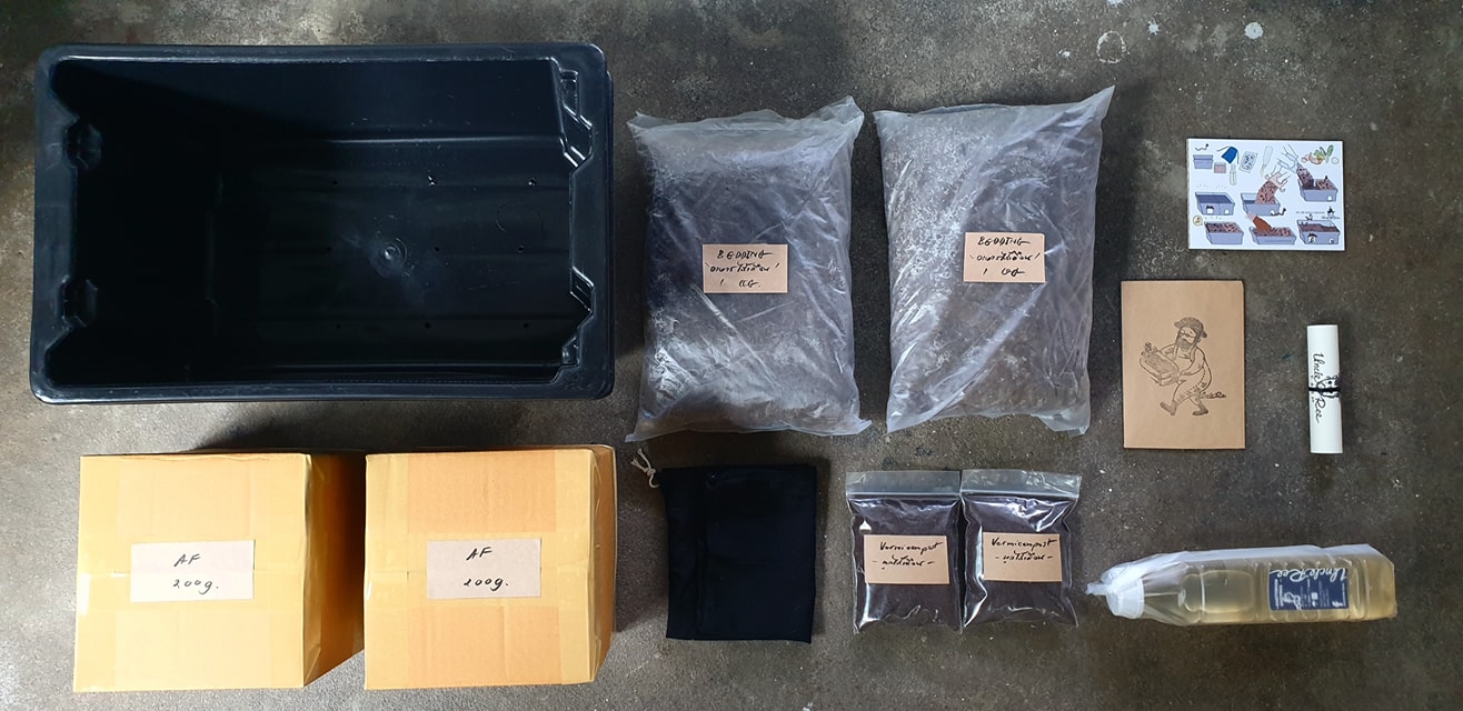 เราขอเริ่มเล่าให้ฟังจาก Af Set A (1,000 บาท) ชุดเลี้ยงไส้เดือนพื้นฐานสำหรับเหล่า Beginner ที่ทางฟาร์มลุงรีย์เขาทำออกมาเป็นบ็อกซ์เซตให้ได้สั่งกันไปถึงหน้าบ้าน (หรือถ้าขับรถไปรับเองที่ฟาร์มก็มีส่วนลดให้ด้วยนะ) ด้านในประกอบด้วยพระเอกหลักของเราแบบตัวเป็น ๆ ซึ่งได้แก่ ไส้เดือนสายพันธุ์ African น้ำหนัก 250 กรัม จำนวน 2 กล่อง (อย่าถามว่ากี่ตัวนะ แต่พี่รีย์เขาคำนวณมาแล้วว่ามากพอจะผลิตปุ๋ยให้ต้นไม้ที่บ้านเราได้แบบสบาย ๆ) ต่อด้วยกระบะเลี้ยงจำนวน 2 ชุด เบดดิ้งอาหารสำเร็จ 2 ถุง ที่มากพอสำหรับเป็นอาหารให้น้องไส้เดือนได้นานถึง 15 วัน รวมถึงมูลไส้เดือนและจุลินทรีย์สำหรับปรับสภาพไส้เดือนในการเลี้ยงระยะแรก