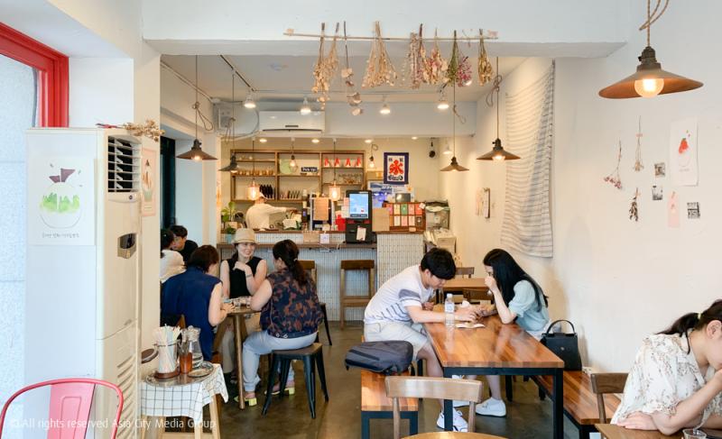 ร้านขนาด 1 คูหากะทัดรัดนี้มีขนาดไม่ใหญ่มาก จึงไม่แปลกที่ลูกค้าจะแน่นร้านตลอดเวลา โดยเฉพาะช่วงบ่ายไปจนถึงเย็น ที่บางครั้งถึงกับต้องต่อคิวรอหน้าร้านกันเลยทีเดียว ทั้งร้านมีเพียง 8 โต๊ะ และ 2 บาร์ที่สามารถนั่งได้เช่นกัน ภายในร้านมีสไตล์การตกแต่งคลีน ๆ กึ่งมินิมอลสไตล์เกาหลี ทั้งการนำรูปโพราลอยด์มาติดผนังสีขาวมุมหนึ่ง อีกมุมหนึ่งตกแต่งด้วยกิ่งดอกไม้แห้งง่าย ๆ แต่น่ารักชะมัด แต่ทางร้านก็ยังแอบเอาของตกแต่งจากญี่ปู่นมาหยอดไว้ทั่วร้านให้ได้อารมณ์ทั้งญี่ปุ่นและเกาหลีด้วยเช่นกัน