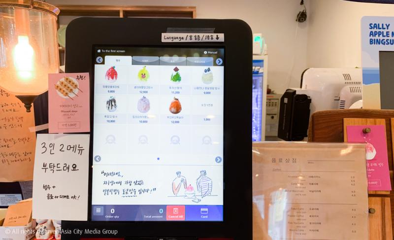 เข้ามาถึงในร้านแล้วก็จัดแจงหาที่นั่งด้วยตัวเองได้เลย แล้วมาสั่งน้ำแข็งไสที่เครื่องรับออเดอร์อัตโนมัติบริเวณหน้าเคาน์เตอร์แทน ซึ่งเครื่องรับออเดอร์นี้จะสามารถจ่ายด้วยบัตรเครดิตเท่านั้น หากต้องการจ่ายด้วยเงินสด ก็สามารถแจ้งพนักงานที่เคาน์เตอร์ได้เช่นกัน โดยพนักงานจะเป็นคนรับออเดอร์ด้วยตัวเอง (แอบบอกว่าสาขานี้ พนักงานทั้งร้านเป็นอปป้าน่ารัก ๆ ทั้งร้านเลยนะ พ่อค้าแซ่บที่แท้ทรู) โดยทางร้านมีกฎอยู่ว่า หากมากัน 2 คน ต้องสั่งบิงซู 1 ถ้วย หากมา 3 คน ต้องสั่งบิงซู 1 ถ้วย กับ Side Dish 1 อย่าง หรือเครื่องดื่ม 1 แก้ว หากมา 4 คน ต้องสั่งบิงซู 2 ถ้วย เป็นต้น ดังนั้นอย่าลืมกคิกาของเขาด้วยล่ะ