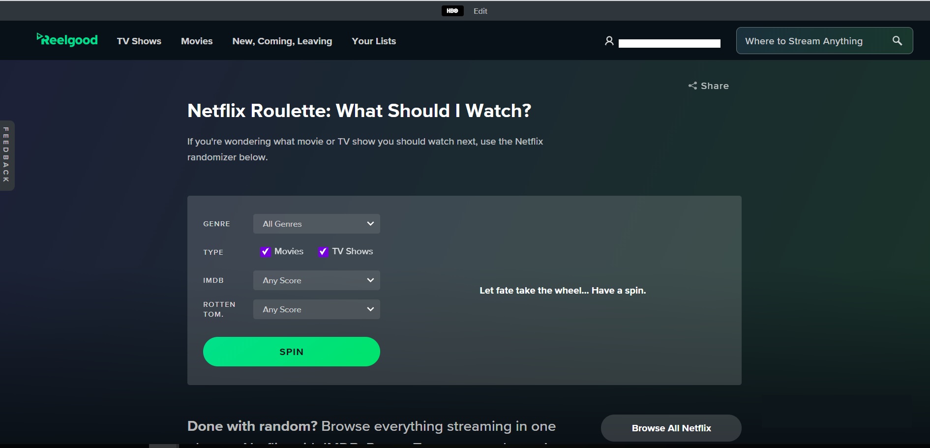 เราทดลองใช้ด้วยการเลือกแรนด้อมหนังในสตรีมมิงที่เรารักอย่าง Netflix ดูก่อน โดยนอกจากจะเลือกมาจากหนังและซีรีส์ที่มีอยู่ทั้งหมดใน Netflix แล้ว เจ้ารูเล็ตต์อันนี้ยังสามารถปรับแนวหนังที่ชอบได้ด้วย เช่น เลือกให้สุ่มเฉพาะหนังแนวแฟนตาซีเท่านั้น หรือจะเลือกเฉพาะหนังสารคดีกับกีฬาแค่ 2 อย่างก็ได้ รวมถึงสามารถเลือกให้สุ่มเฉพาะคอนเทนต์หนังหรือซีรีส์ไปเลย หรือจะให้จัดมาทั้งสองอย่างก็ได้เหมือนกัน แถมความน่ารักคือยังมีช่องให้ระบุค่าเฉลี่ยคะแนนจาก IMDb กับ Rotten Tomatoes ได้อีก จุดนี้ใครอยากดูหนังน้ำดี เป็นที่ถูกตาต้องใจนักวิจารณ์ ก็เลือกเอาที่คะแนนสูง ๆ 70-80 เปอร์เซ็นต์ขึ้นไปได้ตามสะดวก