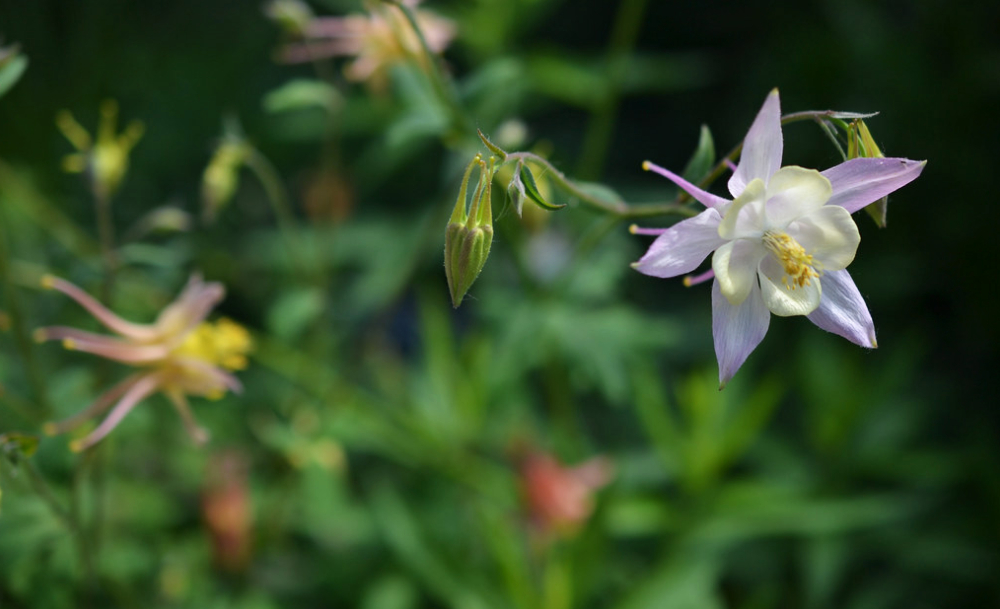 ถัดมาที่ดอกที่ไม่คุ้นหูนัก แต่สายจัดสวนต้องเคยได้ยิน เพราะให้สีสันสดใสจัดจ้าน กับดอกเดลฟินเนียม ดอกโคลัมไบน์ และดอกระฆัง (แคมพานูลา) โดยส่วนใหญ่เจ้าดอกไม้ทั้งสามนี้จะเป็นสีโทนน้ำเงิน-ม่วง เลยมักถูกจัดอยู่ด้วยกัน เป็นเฉดที่ตัดกับสวนเขียว ๆ ดีนักล่ะ ซึ่งบทที่ปรากฏในหนังสือบอกว่า The green alcoves filled themselves with amazing armies of the blue and white flower lances of tall delphiniums or columbines or campanulas.