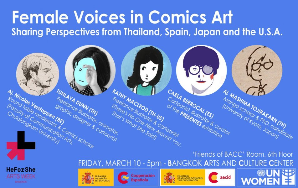 ความจริงแล้วงานเสวนานี้เป็นส่วนหนึ่งของ Presentes นิทรรศการแสดงภาพวาดการ์ตูนคัดสรรโดย Carla Berrocal ศิลปินสาวชาวสเปน โดยตัวงานนำเสนอมุมมองและบทบาทของผู้หญิงในวงการการ์ตูน ความน่าสนใจคือกิจกรรมเสวนามีศิลปินอีก 5 คนมาร่วมแสดงความคิดเห็นกัน ได้แก่ Nicolas Verstappen, Tuna Dunn, Kathy MacLeod และ Mashima Tojirakarn
