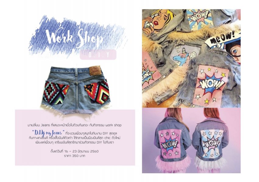 อันนี้เป็นคอร์สที่สาวๆ ควรไปและต้องไป! เพราะเค้าจะเปิดคอร์สเวิร์คช็อป D.I.Y my jeans ให้เราเอายีนส์ตัวเก่าที่ไม่ค่อยได้ใส่มาแปลงโฉมด้วยผ้าสกรีนแพทเทิร์นและของตกแต่งสุดคิ้วท์ ไม่ว่าจะเป็นแจ็คเก็ตยีนส์ กางเกงยีนส์ขาสั้นหรือขายาว ก็เอามาทำได้ทั้งนั้น