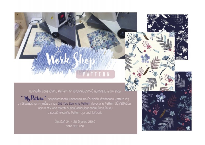 มาลองเรียนสร้างลายแพทเทิร์นเก๋ๆ กันกับเวิร์คช็อป My pattern เอาไว้ใช้สำหรับออกแบบกระเป๋าหรือเสื้อผ้าในลายโปรดของเราเอง ที่พิเศษคือแพทเทิร์นที่นำมาให้เลือกใช้ เป็นผลงานจากคุณอั้น ดีไซน์เนอร์สาวสุดน่ารักจากเพจ Did you see any pattern นั่นเอง