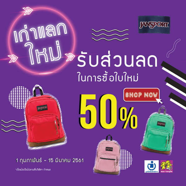 เอากระเป๋าใบเก่าไปแลก แล้วรับส่วนลด 50% ของกระเป๋าทุกใบจาก JanSport ได้ที่สาขาสยามเซ็นเตอร์, เซ็นทรัลเวิล์ด, เมกา บางนา และอื่นๆ รวม 50 สาขา