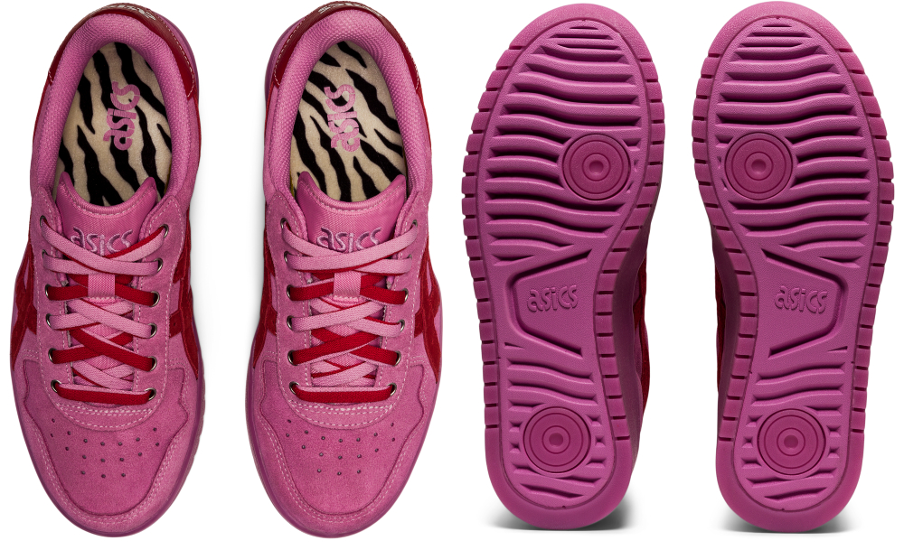 เริ่มกันที่คู่แรก สนีกเกอร์สีชมพูกระแทกสายตาที่มาพร้อมกิมมิกลายม้าลายตรงพื้นรองเท้าด้านใน และโลโก้ ASICS ด้านหลังรองเท้า ซึ่งตัวเชือกมีให้เลือก 2 สี คือแดงและชมพู รับกับ ASICS Stripe ซิกเนเจอร์ เสริมความปังให้สาว ๆ ได้ดีทีเดียวแหละ