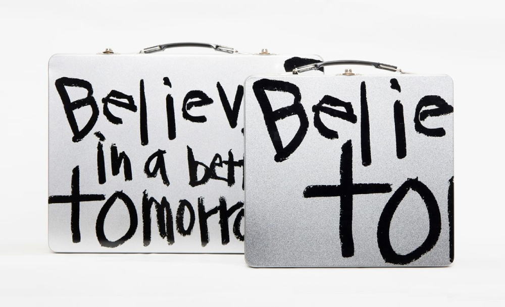 'Believe in a better tomorrow' Tin Trunk ทำออกมา 2 ไซซ์ ขนาดเล็กเป็นสี่เหลี่ยมจัตุรัส ขนาดใหญ่เป็นสี่เหลี่ยมผืนผ้า ซึ่งก็เหมาะมือทั้งคู่ พร้อมดีเทลพิเศษคือภายในมีโลโก้ของร้าน Comme des Garçons Aoyama สุดเอ็กซคลูซีฟของสาขานี้ ประทับอยู่ด้วย โดยที่ข่าวบอกด้วยว่าตัวกระเป๋านั้นน้ำหนักไม่ได้มากนัก เพราะฉะนั้น จากดีไซน์แล้ว จะสามารถใช้ถือใส่ของไปไหนมาไหน หรือจะวางเป็นกล่องใส่ของอยู่กับที่ก็เก๋ได้ทั้งนั้น