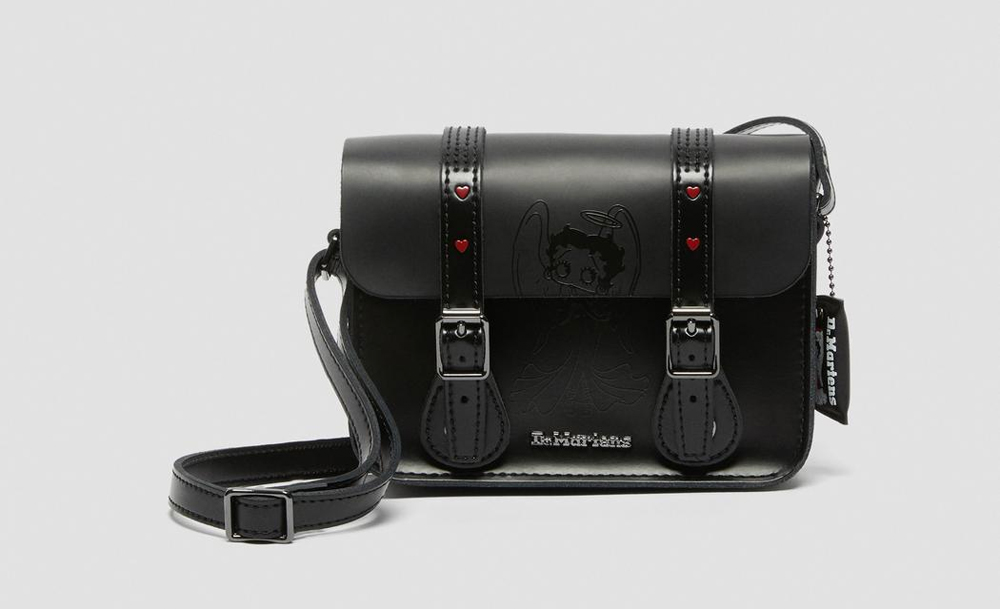 นอกจากรองเท้าแล้ว ใน Dr. Martens x Betty Boop ยังมีอีกหนึ่งไอเทมเด็ดที่เป็นกระเป๋าหนังสีดำสะพายข้างทรง Satchel หรือทรงนักเรียน ขนาดมินิ 7 นิ้ว คิวต์สุด ๆ แถมลายพรินต์รูป Betty Boop เวอร์ชัน Angel ก็น่ารักจนรู้ตัวอีกทีก็อาจเผลอกดลงตะกร้ายกคอลฯ ไปแล้ว