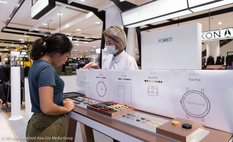 และด้วยความที่เป็น Pop-Up Store แรกของ FORREST ก็ต้องให้สมกับคอนเซปต์ Laboratory สักหน่อย ด้วยบริการ D.I.Y. นาฬิกาข้อมือได้ด้วยตัวเองตามชอบเลย โดยเริ่มเลือกที่เคส มาแมตซ์กับสายนาฬิกาและ Buckle ที่ชอบเพื่อบ่งบอกถึงตัวตนของเรามากที่สุด สุดท้ายคือการสลักชื่อลงที่หลังตัวเรือน ที่สลักด้วยเลเซอร์ และสลักได้หมดทั้งตัวอักษร ลายมือ ไปจนถึงภาพวาดของเราเอง สนนราคาพิเศษที่ 4,290 บาทเท่านั้น ขอบอกว่าคุ้มมาก เพราะที่จริงราคาเต็มอยู่ที่ 5,200 บาทเลยนะ แต่ถ้าใครอยากสลักชื่ออาจต้องรอสินค้า 2 สัปดาห์โดยการจัดส่งให้ถึงบ้าน แต่ถ้าไม่สลัก (ซึ่งราคาจะลดลงไปอีก 590 บาท) ก็สามารถรับนาฬิกากลับบ้านไปได้เลย