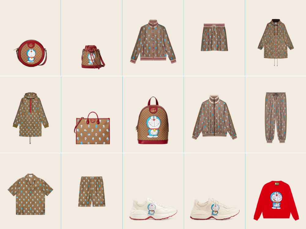ถือว่าเป็นแคมเปญที่สมศักดิ์ศรีจริง ๆ สำหรับโปรเจกต์การคอลแลบอเรชันที่เปิดตัวในช่วงต้นปี 2021 ที่แบรนด์ Gucci แฟชั่นเฮาส์ระดับลักชัวรีจากอิตาลี มีอายุครบ 100 ปี พอดิบพอดี เพราะเขาเลือกที่จะฟีเจอริงกับคาแรกเตอร์ที่เป็นที่รักของแฟน ๆ ทั่วโลกมาหลายสิบปี (และเพิ่งมีหนังฉลอง 50 ปีไป) อย่าง Doraemon แมวหุ่นยนต์ที่ดูจะทำให้ทุกอย่างเป็นจริงได้สำหรับทุกคน ซึ่งคอลเลกชันนี้ก็ไม่ได้มีแค่กระเป๋าหรือแอกเซสเซอรีนะ แต่มาทั้งตู้เสื้อผ้าแบบหัวจรดเท้าเลย