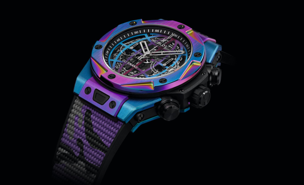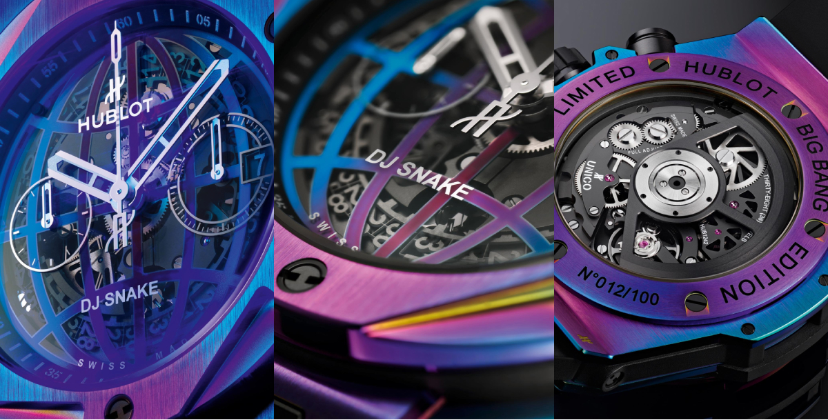 Hublot x DJ Snake เป็นนาฬิกา Big Bang 45mm ที่นำเสนอดนตรีอิเล็กทรอนิกส์ ซึ่งเป็นตัวตนของ DJ Snake ด้วยสี multi-color วัสดุเป็นไทเทเนียมเนื้อซาติน หน้าปัดแซฟไฟร์ สายลายพรางสีดำ เทา และม่วง สำรองพลังงานได้ 72 ชม. สามารถกันน้ำได้ 100 ม. รุ่นนี้ผลิตออกมาแค่ 100 เรือนเท่านั้น!