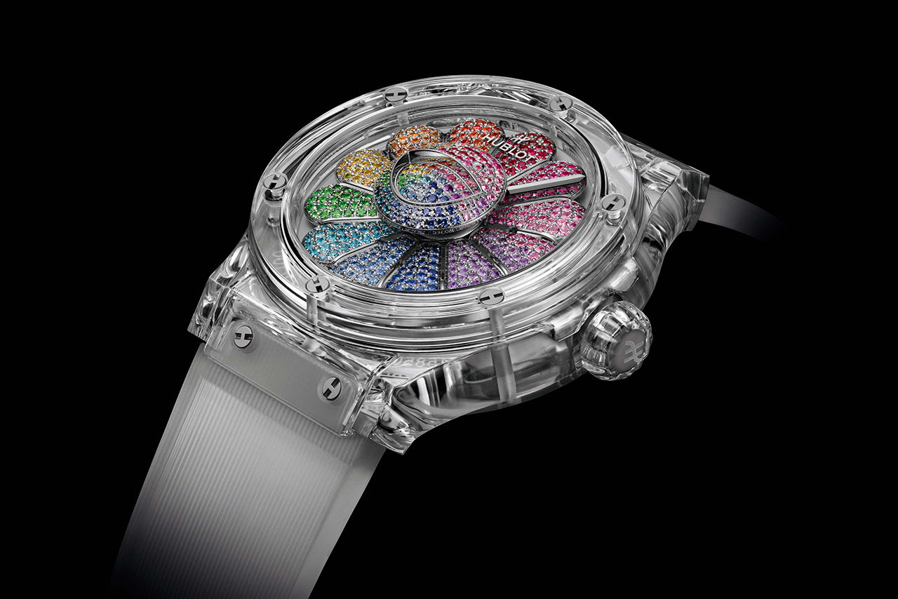 นาฬิกา Hublot x Takashi Murakami ลิมิเต็ดเอดิชันรุ่นล่าสุดนี้ มาในหน้าปัดแซฟไฟร์คริสตัลโปร่งใสไซซ์ 45 มม. โดยมีเจ้าดอกมุราคามิอันแสนเป็นเอกลักษณ์ยิ้มรับทุกคนอยู่ตรงกลาง ซึ่งแค่พาร์ตดอกไม้นี่ก็ดีเทลละเอียดทีเดียวล่ะ และเขาใช้อัญมณีหลากสีสันมากถึง 487 เม็ด เพื่อมาประกอบให้น้องดอกไม้ออกมาสมบูรณ์แบบที่สุด