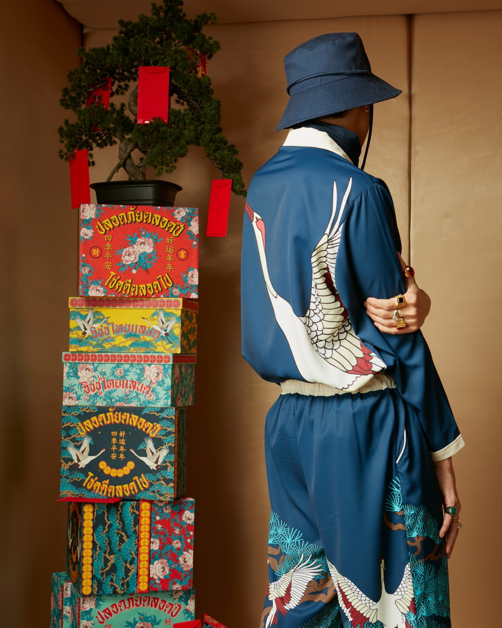 การหยิบคอนเซปต์ความจีนมาดีไซน์ในแบบของ ISSUE ในครั้งนี้ เขาก็มาพร้อมการหยิบสัญลักษณ์แห่งความมงคลตามความเชื่อจีนมาใส่ลงไปในลายผ้าได้อย่างมีกิมมิก อาทิ นกกระเรียน สัตว์มงคลที่สื่อถึงความยั่งยืน ต้นบอนไซ ตามความเชื่อของคนจีน ถือเป็นต้นไม้ที่มีความเป็นสิริมงคล แสดงถึงความโชคดี โชคลาภ ร่ำรวย และดอกโบตั๋น สะท้อนความเชื่อในเรื่องความร่ำรวย โชคลาภ บารมี ถือเป็นดอกไม้ที่สวยงาม อ่อนหวาน และแฝงความเป็นสิริมงคล เสมือนคำอวยพรที่ ISSUE อยากส่งต่อความรัก ความปรารถนาดี ให้กับทุกคน