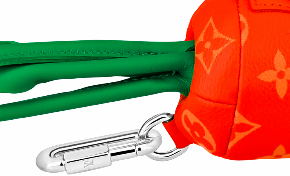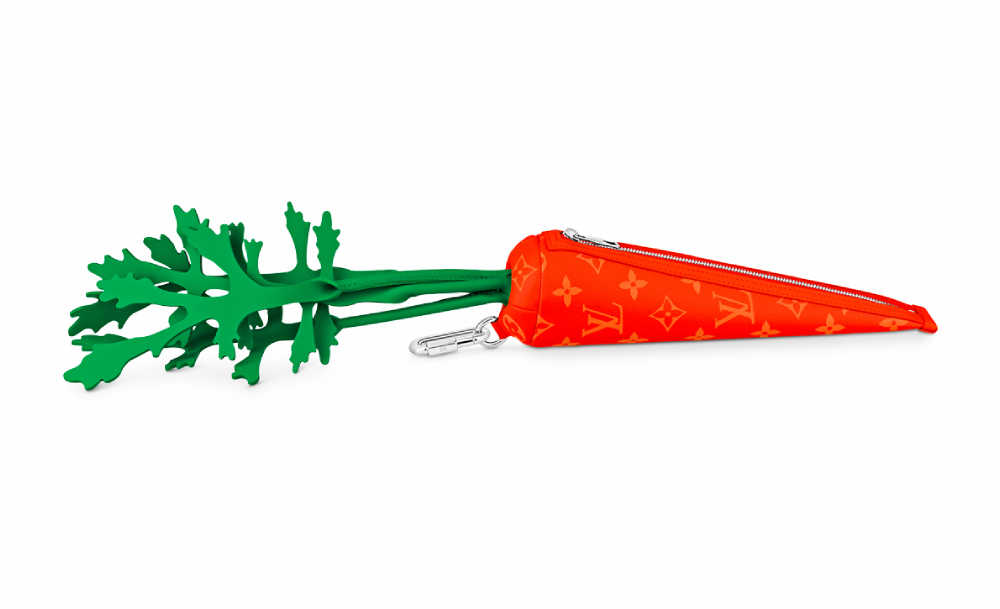ส่วน Carrot Pouch ก็เปรี้ยวไม่แพ้กัน (แต่ดูจะใส่ของอะไรไม่ได้เลย) ด้วยการทำตัวเป็นแคร์รอตใหญ่เกินจริงที่มีตัวฮุก นำไปแขวนกับกระเป๋าใหญ่ได้สะดวกมาก ๆ เพิ่มความชิคด้วยการพรินต์โมโนแกรมของแบรนด์ลงบนบอดี้หนังสีส้มสด ความยาวกระเป๋าอยู่ที่ 25 ซม. และมีฮาร์ดแวร์สีเงิน ตัดกับสีส้มเขียวอย่างลงตัว