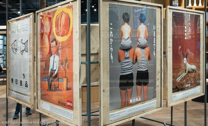 ใกล้ ๆ กันกับมุมกาแฟ จะมีโซนที่เรียกว่า Open Muji ที่ทำขึ้นมาเพื่อแสดงงานศิลปะ อย่างในตอนนี้ก็เริ่มประเดิมด้วยนิทรรศการ MUJI Poster Archive โปสเตอร์สุดแสนจะคลาสสิกที่บอกเล่าเรื่องราวของแบรนด์ Muji ที่เริ่มต้นมาจากวิกฤตเศรษฐกิจของญี่ปุ่นในปี 1980 จนห้าง Seiyu ต้องเปลี่ยนกลยุทธมายึดหลัก no-brand quality goods ขายของโดยเน้นไปที่ การคัดเลือกวัตถุดิบ การปรับปรุงพัฒนากระบวนการต่าง ๆ และการสร้างบรรจุภัณฑ์ที่เรียบง่าย ซึ่งบอกเลยว่าถ้าใครอินกับแบรนด์นี้ มาดูนิทรรศการนี้จะยิ่งอินเข้าไปอีก