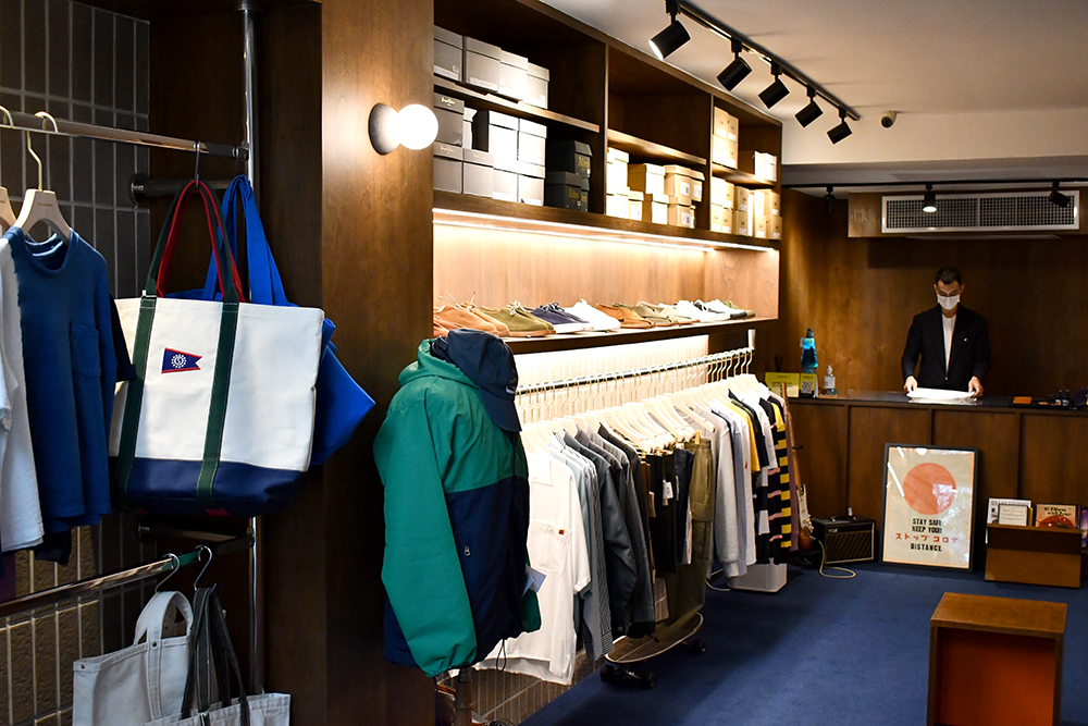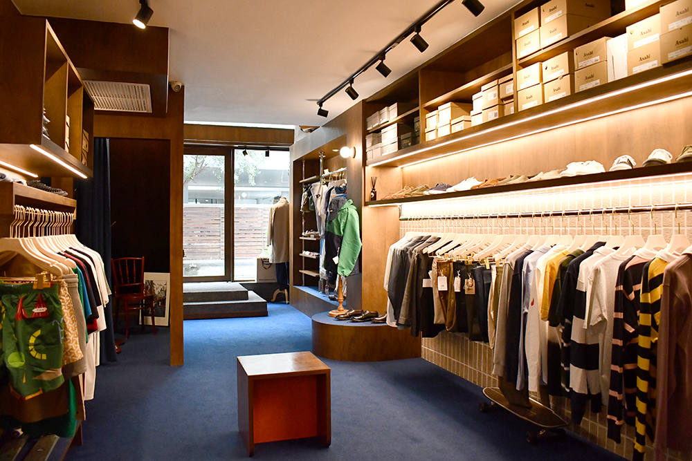 เราชอบดีไซน์การแต่งร้านที่เลือกใช้โทนสีน้ำเงินเข้มของพรมมาตัดกับสีน้ำตาลเข้มของผนังและเฟอร์นิเจอร์ไม้ ให้ความรู้สึกเหมือนเข้าไปในห้องชมรมสปอร์ตคลับของมหาวิทยาลัยเมืองนอก มีกลิ่นอาย Preppy แบบเด็กอังกฤษนิด ๆ และความมินิมอลแบบญี่ปุ่นหน่อย ๆ พร้อมการจัดวางเลย์เอาต์ร้านและชั้นวางของให้ง่ายต่อการชอปปิง พร้อมสเปซโล่ง ๆ คลีน ๆ ที่คอนเนกต์กันระหว่างพื้นที่ชั้นล่างและชั้นบนอย่างเรียบง่ายลงตัว ไม่หวือหวาแต่ดูเทสต์ดี
