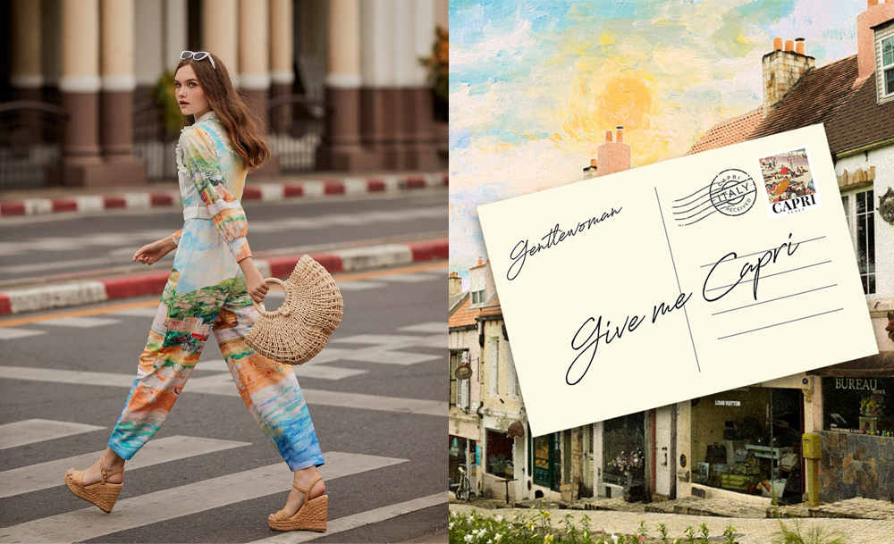 ลายผ้าในคอลฯ นี้ยังได้รับแรงบันดาลใจมาจากเกาะคาปรี ประเทศอิตาลี ชวนให้สาว ๆ จินตนาการถึงคลื่นทะเลที่ซัดเข้าฝั่ง ชายหาดสีขาว สถาปัตยกรรมที่มีเอกลักษณ์ และธรรมชาติที่สวยงามบนเกาะ เรื่องราวในคอลฯ นี้จึงเป็นเหมือนการบอกเล่าเรื่องราวของศิลปินสาวที่แพ็กกระเป๋าออกเดินทางไปค้นหาแรงบันดาลใจใหม่ ๆ ลายพิมพ์ทุกชิ้นจึงเป็นเหมือนบันทึกของสิ่งที่เธอเจอระหว่างทริปนี้ ไม่ว่าจะเป็นลายพิมพ์แลนด์สเคปสวย ๆ ของเกาะคาปรีอย่างลาย The Capri Island, ลายพิมพ์ The Homeland Capri สถาปัตยกรรมและธรรมชาติที่อยู่ด้วยกันอย่างสวยงาม, Dancing Paper Flower ลายพิมพ์ดอกไม้สีสันสดใสชวนให้รู้สึกสดชื่นเมื่อได้สัมผัส, The Lemon Tiles ลวดลายกระเบื้องสีน้ำเงินตัดกับลูกเลม่อนสีเหลืองสด, Colourful Island ลวดลายกราฟิกที่ถูกตัดทอนมาจากดอกไม้ และลวดลายของธรรมชาติบนเกาะ และสุดท้าย สีสันของเกาะคาปรีที่นำเสนอผ่านลายพิมพ์ My Capri Palette