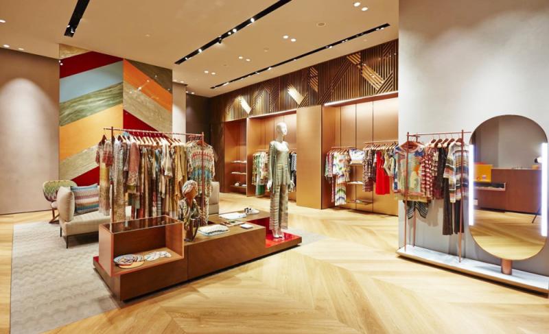 หน้าตาของชอปใหม่นี้ก็ไม่ทิ้งเอกลักษณ์ฉบับ Missoni ไปไหนไกล จากการดีไซน์แบบร่วมสมัยที่ยังคงความเฮอริเทจ เน้นโทนสีไปทางส้มอมสนิมตัดกับความเรียบเท่ของผนังสีเทาแล้วแต่งแต้มความมีชีวิตชีวาขึ้นหน่อยด้วยสีสันของซิกเนเจอร์อย่างแพทเทิร์นซิกแซกที่วางตัวอยู่ทั่วทุกมุมแบบหันซ้ายหันขวาไปทางไหนก็ต้องเห็น มวลรวมให้ความรู้สึกหรูหราแต่ก็ผ่อนคลายเมื่อไปเยือน