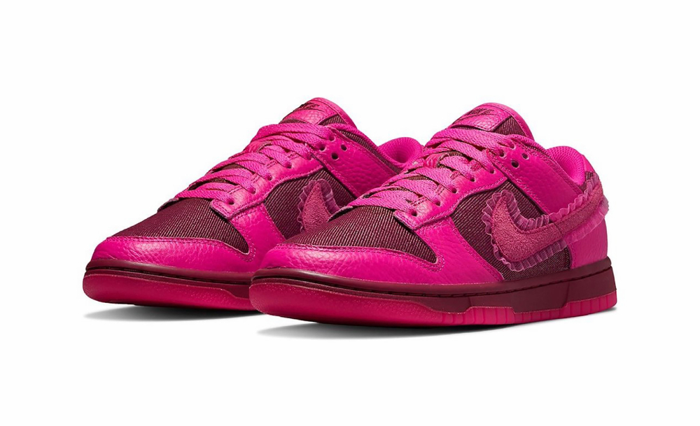 Nike Dunk Low 'Valentine's Day' มาในเฉดชมพูฮอตพิงก์สุดร้อนแรง แต่ที่สะดุดตาเรายิ่งกว่าเฉดสีสด ๆ ที่เขาเลือกใช้ก็คือดีเทลตรงส่วนสวูชที่ขลิบระบายพลิ้ว ๆ แสนจะมุ้งมิ้งด้วย เป็นการผสมความเท่ ความร้อนแรง และความเฟมินีน เอาไว้ในไอเทมเดียวได้เก๋ดีจริง ๆ